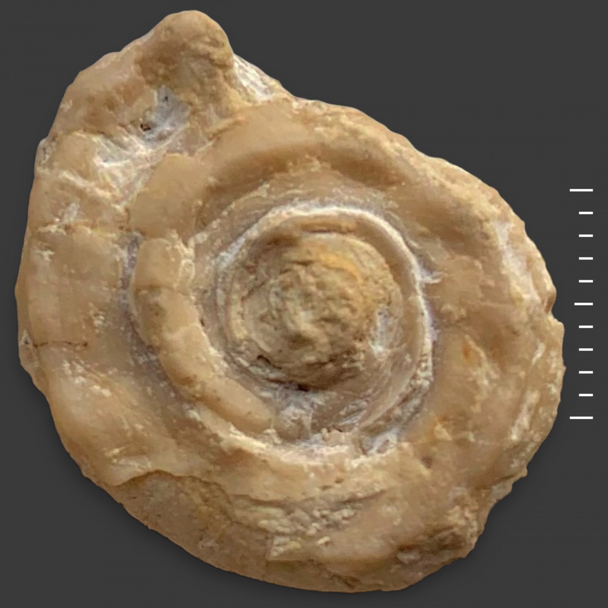 По наличию характерных бугорков на оборотах и с помощью атласа Шмакова определяется как Straparollus moniliferus (Romanovsky), однако, согласно вышеуказанному атласу, такое определение предполагает гжельский ярус верхнего карбона, что противоречит наличию соседней с Выселками деревни Коробчеево с её одноименной свитой среднего карбона. Сборы 2023 года.