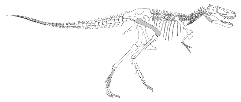 Скелет тираннозавра Джейн. Белым цветом отмечены найденные кости, серым - утерянные.
