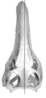 Череп тираннозавра Джейн, вид сверху. Хорошо заметна асимметрия черепа, вызванная травмой. Иллюстрация с сайта Университета Северного Иллинойса.
