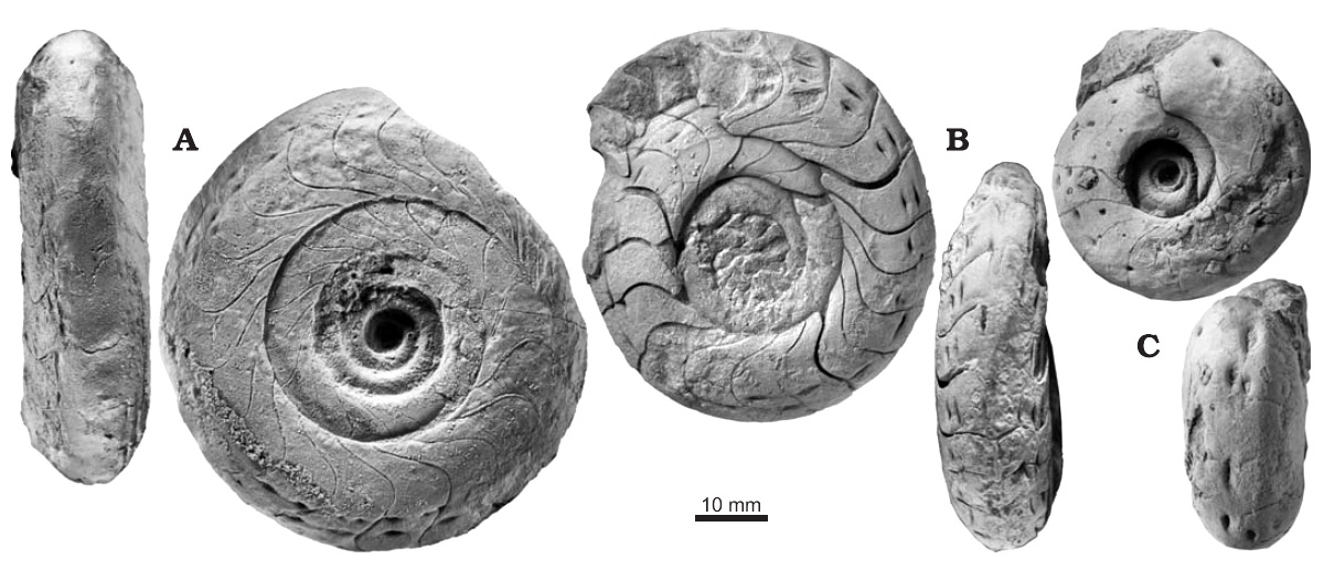 Следы паразитов у девонских аммоноидей. A. Sellanarcestes ebbighauseni, В. Sellanarcestes cf. ebbighauseni, С. Anarcestes sp.