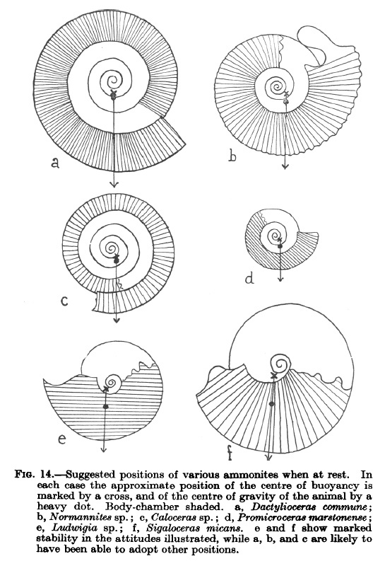 Для определения прижизненного положения раковины аммонита они почему-то воспользовались публикацией А.Е. Трумэна, вышедшей более семидесяти лет назад (Trueman, A.E., 1941. "The ammonite body-chamber, with special reference to the buoyancy and mode of life of the living ammonite"). Эта публикация, весьма популярная, тем не менее, многократно подвергалась критике, поскольку для расчета прижизненного положения раковины аммонита ее автор принял тело аммонита за однородную субстанцию, заполняющую собой жилую камеру. Тот факт, что в активном положении самая тяжелая часть тела моллюска – голова со щупальцами и массивным челюстным аппаратом находились за пределами устья, Трумэн не учитывал. Поэтому почти все аммониты у Трумэна плавали на боку. Каким образом при этом они заставляли свою раковину двигаться (особенно аммониты с ростром на устье) Трумэн не объяснил.