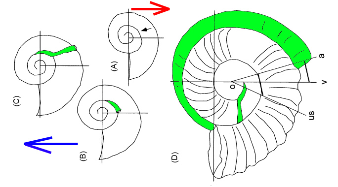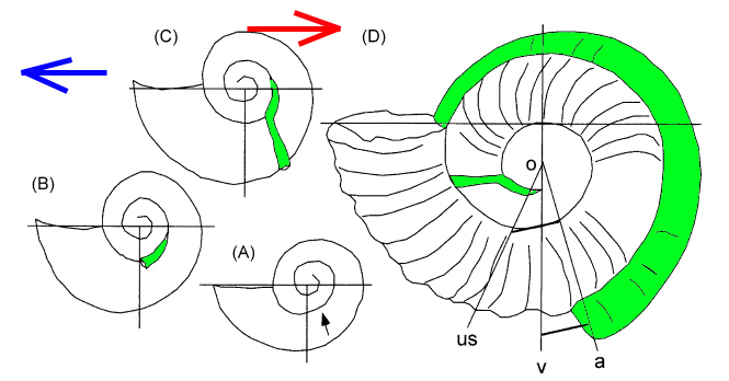 Как известно, аммониты – головоногие моллюски, вымершие 65 миллионов лет назад, имели внешнюю раковину. Раковина была разделена перегородками на отдельные камеры, и тело моллюска находилось в передней – самой большой камере (она называется жилой камерой). У разных видов аммонитов она имеет длину от половины до полутора оборотов раковины. Остальные камеры, заполненные жидкостью и газом, объединены названием "фрагмокон". Когда аммонит рос, он постепенно надстраивал жилую камеру впереди, а сзади периодически строил новые перегородки фрагмокона.