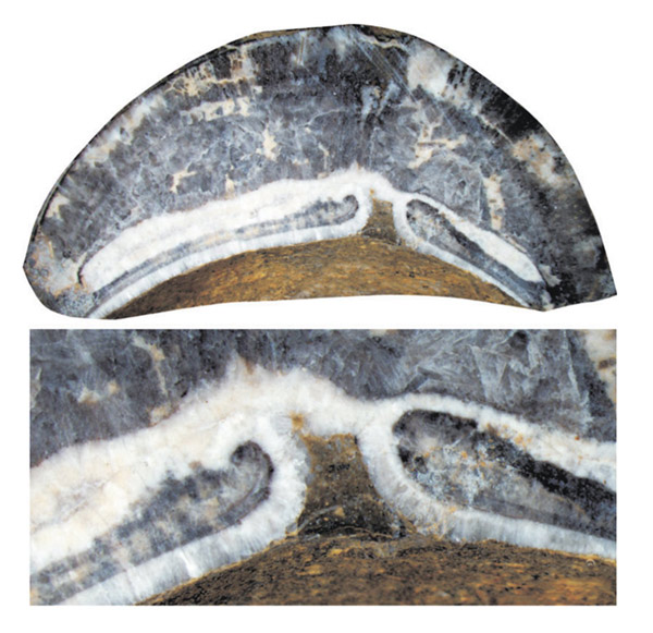 Прижизненная окраска на раковине Sphooceras. Вид сбоку. Иллюстрации из публикации в Bulletin of Geosciences