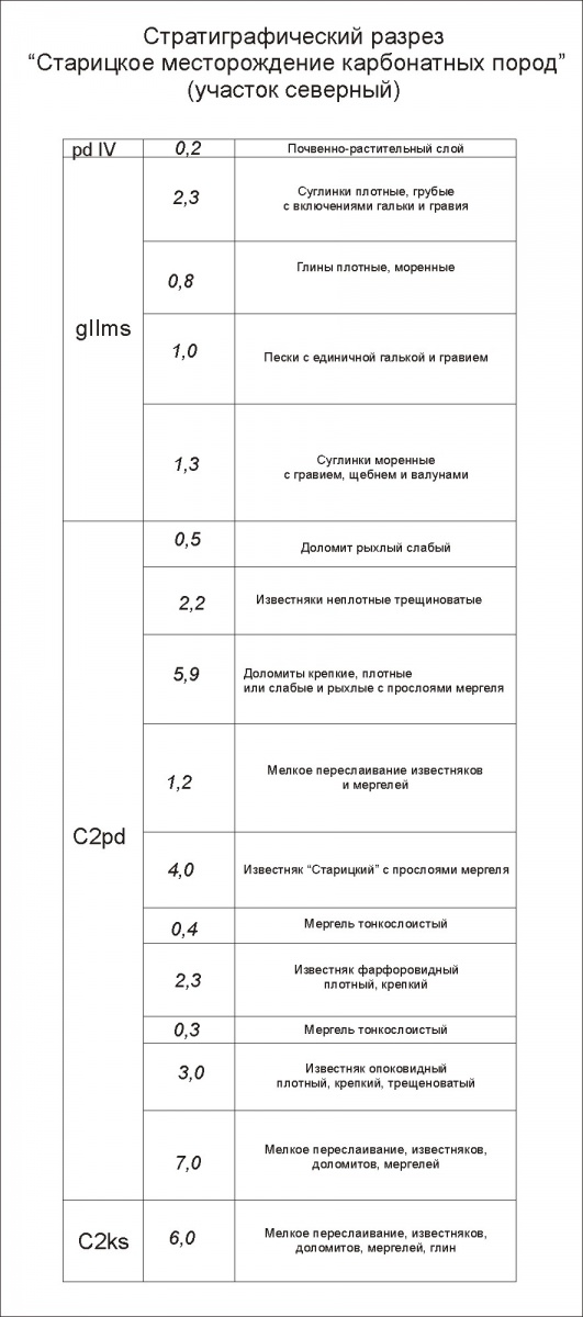 Стратиграфический разрез “Старицкого месторождения карбонатных пород” можно посмотреть здесь