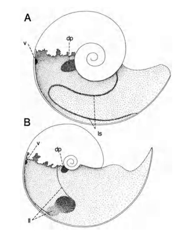 Латеральный синус (вверху) и латеральный отпечаток мускула (внизу) Схемы из публикации Doguzhaeva, L.A. and Mutvei, H. 1996. Attachment of the body to the shell in ammonoids. In: N.H. Landman, K. Tanabe, and R.A. Davis (eds.), Ammonoid Paleobiology, 43–63. Plenum Press, New York.