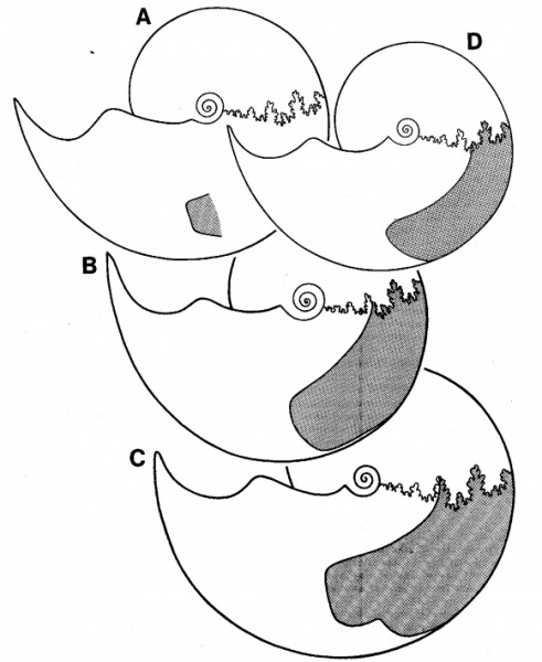 Видимо, иногда в ходе роста раковины старые передние латеральные синусы оказываются в задней части жилой камеры и, может быть, даже используются для формирования новой области прикрепления мускулатуры.