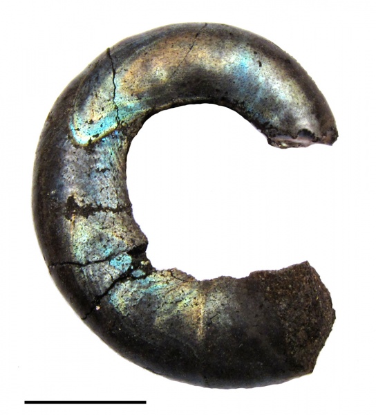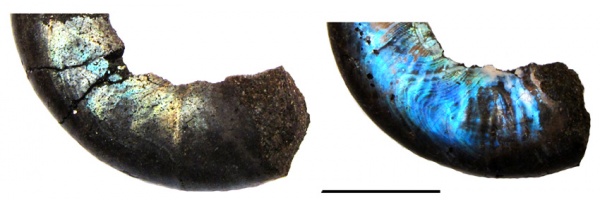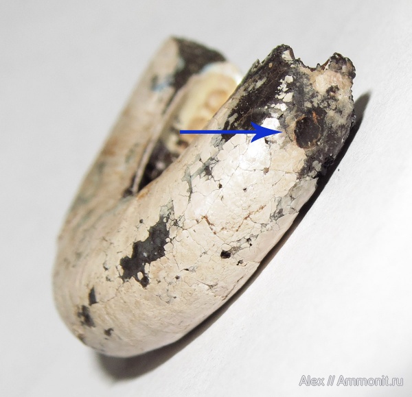 Фрагмент фрагмокона Garniericeras catenulatum со следом мускульного отпечатка. Фото из публикации Mironenko, A.A. 201X. The soft-tissue attachment scars in Late Jurassic ammonites from Central Russia. Acta Palaeontologica Polonica
