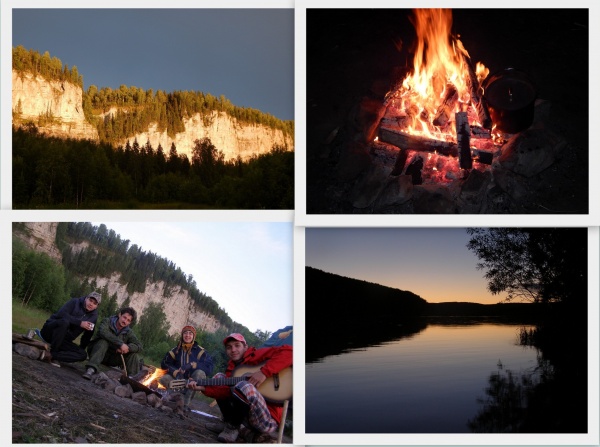 Вечером, посиделки у костра, песни под гитару, созерцание природных красот. Долго не темнело, видимо сказывалась северная широта, и практически до 2 часов ночи можно было видеть 120-тиметровую слоистую громаду Ветлана, противоположный берег. Неспешное течение Вишеры, проплывающие на катамаранах туристы, треск костра, тосты и шутки друзей – все создавало атмосферу умиротворения.