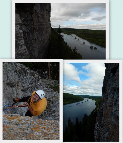 Следующим утром погода порадовала, легкие облака и прохладный северный ветер, сдувающий комарье - условия очень подходящие для прохождения скального маршрута. После приготовления, с другом Геннадием, и по совместительству моим инструктором, идем на исходную точку. Предстоит одолеть 100 метров вертикальной стены. Краткий инструктаж и мы стартуем. Гена как старший и опытный скалолаз и альпинист лезет первым с нижней страховкой, закрепляется на промежуточной станции, и я уже подлажу до него с верхней страховкой, и т.д. до верху. После второй станции и пройденных 70 метров, взору открываются живописные изгибы реки и зелень лесов.