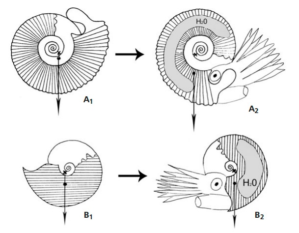 Есть еще один очень интересный момент, связанный с наличием прикрепительной площадки вне жилой камеры у аммонитов. Как ни странно, все еще остается дискуссионным вопрос о прижизненной ориентации раковин аммонитов в толще воды — то есть о том, как было ориентировано их устье. До сих пор при всех расчетах прижизненной ориентации раковин аммонитов палеонтологи исходили из предположения, что мягкое тело аммонита, во-первых, занимало полностью всю жилую камеру от начала и до конца, во-вторых, наружу оно не высовывалось. В принципе всем было понятно, что оба эти утверждения весьма условны, но считалось, что объемом мантийной полости аммонитов и размером их высовывающейся наружу части тела можно пренебречь. В результате таких расчетов большинство аммонитов оказались ориентированы очень странно — устьем вверх (смотрите иллюстрацию ниже — левый столбец), то есть они должны были плавать в позе цветочного горшка, из которого кверху торчали воронка и щупальца.