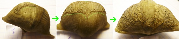 Рис.4.1 Разрастание коллоний мшанок Hederella. Конечно, не совсем правильно соединять в одно изображения обрастания на разных створках брахиоподы, но они хорошо передают концепцию разрастания колоний при повторение коммисуры раковины. Пример хорошо показывает, что мшанка устремляла свои ветви вверх, сохраняя первую линию роста, повторяющую коммисуру раковины. Существуют и другие простые примеры разрастания, они уже частично были рассмотренные ранее и нет смысла их дублировать в данной публикации. В своей работе Allen (1953) написал, что «длина жизни Epizoans организмов ограничена длиной жизни хозяина». В этом есть смысл т.к. движение створок и течений будет сохранять поселенца свободным от ила Korringa (1951) и наоборот в случае гибели хозяина (отмирания ножки) в виду тесноты поселения раковина "выстреливалась" (Сарычева, 1949) под давлением сородичей и ее засыпало осадком и засыпало вместе с поселенцами.