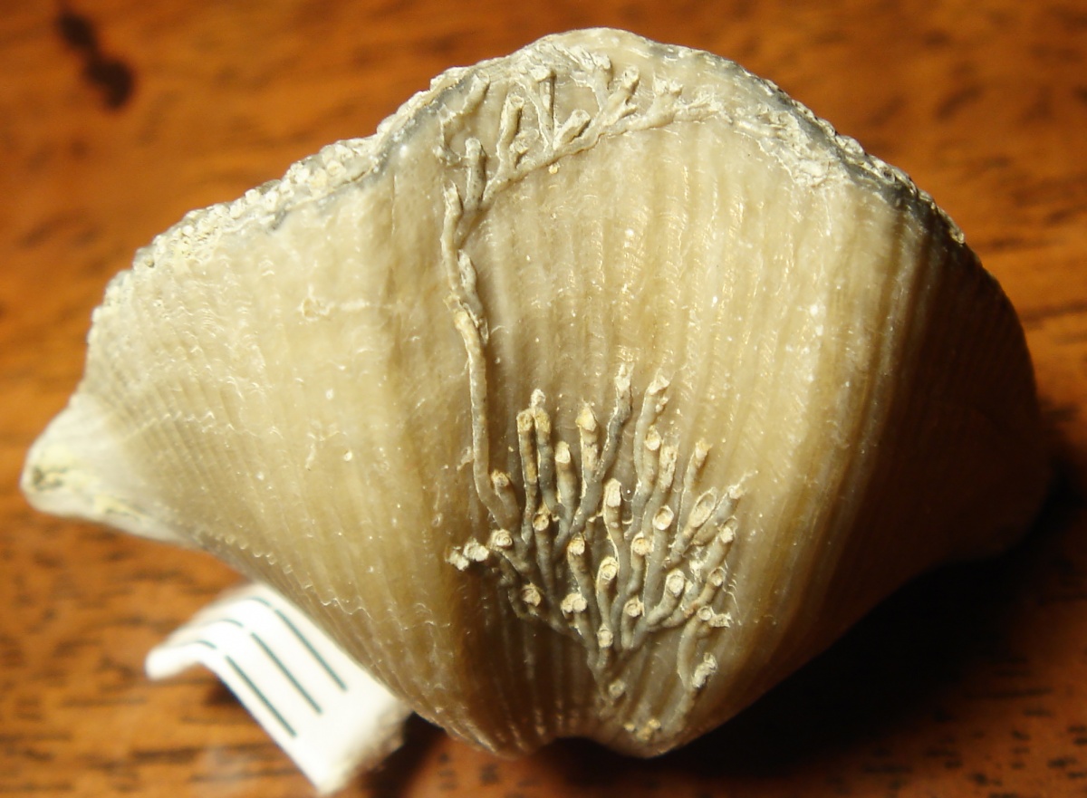 Имеет место быть посмертное заселение мшанки. Складывается впечатление, что илистые отложения постепенно засыпали начальные устья и не давали мшанки разрастись. В результате чего появилась такая вот "елочка" из мшанки.