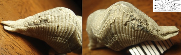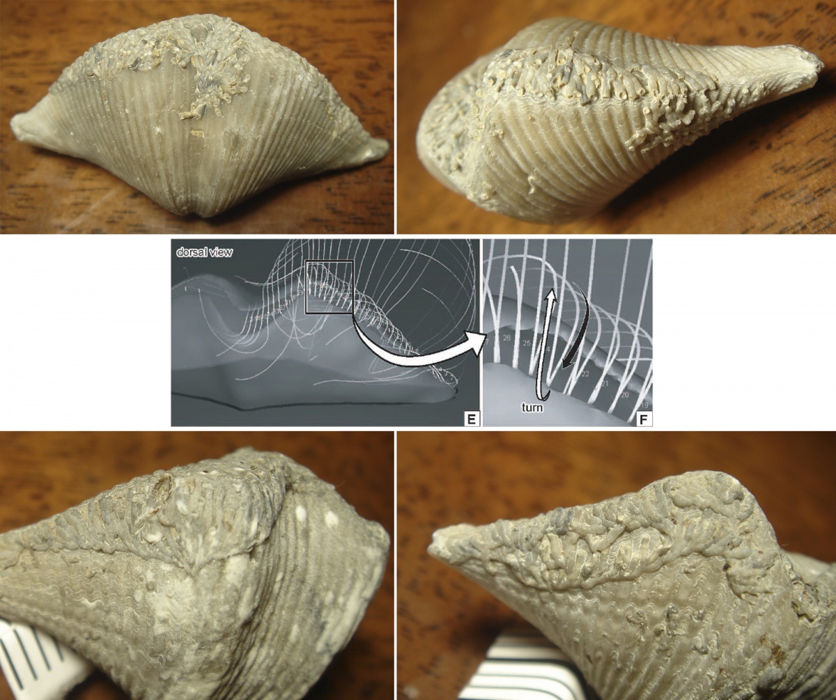 Рис.1.2 Повторение изгибов раковины. Мне попадались упоминания о некоторых доказательствах выравнивания колоний Hederelloid вдоль комиссуры хозяина из статьи в журнале (Anderson and Megivern, 1982), к сожалению сам источник-журнал (Anderson, W.I., Megivern, K.D., 1982. Epibionts from the Cerro Gordo Member of the Lime Creek Formation (Upper Devonian), Rockford, Iowa. Proceedings of the Iowa Academy of Science 89, 71–80.) мне найти не удалось, ограничился рассмотрением их выводов через другие статьи. При этом, еще в 1935 такие поселения указывались Геккером Р.Ф., как "герляндные" поселения. И как видно их этих двух примеров такие "отступы" формировались за счет гибели (остановки роста) колонии мшанки.