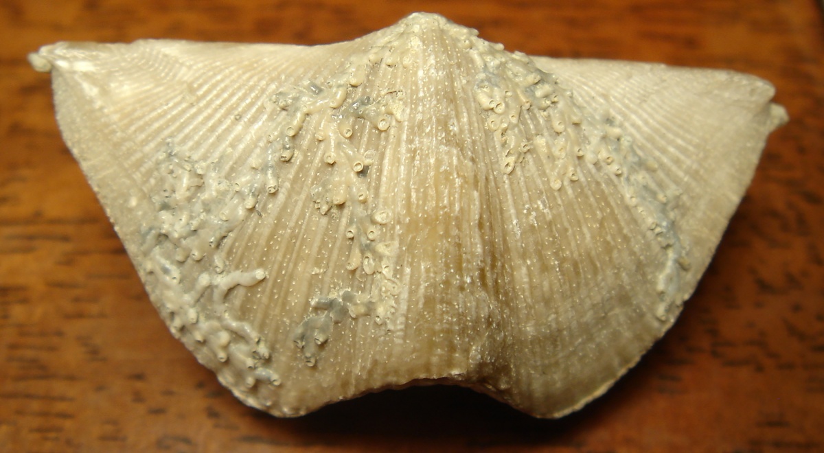 Рис.4.2 Стремление к жизни. Процесс осадконакопления происходил непрерывно и это вносило свои коррективы в разрастания обрастателей. На данном примере хорошо видно, что только одной веточке мшанки удалось снова разрастись в небольшую колонию, устремленную к переднему краю раковины.