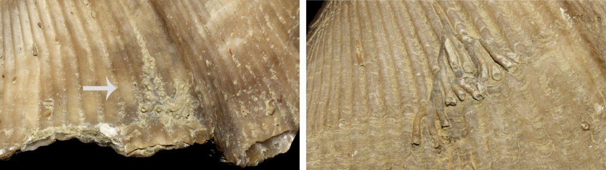 Рис.5.1 Взаимоотношения между поселенцами с "отступом" поселенца от краев раковины. Типовой пример, когда часть мшанковых трубочек доходят почти до самого края створки и не переходят на противоположную, что свидетельствует о том, что мшанка на ней поселились именно при жизни плеченогого. Видимо колония была засыпана донными осадками и только часть веточек продолжила свой рост. Мы видим одну из разновидностей не рассмотренного в предыдущей публикации "отступа" поселенца, когда брахиопода продолжила свой полный рост, а поселенец только частично. Данный пример наиболее близок к иллюстрации Геккера Р.Ф.(1935а). Здесь интересны взаимоотношения между самими поселенцами (в иностранной литературе "Epizoans–Epizoans interactions", "sclerobiont–sclerobiont interactions", "epibiont-epibiont relationships" и т.д.), которые представлены на правой фотографии. Примечательно что часть мшанок находятся под "проблематичным" поселенцем (на текущий момент не совсем понятно брахиопода, гастропода или двустворка и в будущем будет отдельная публикация по ним).
