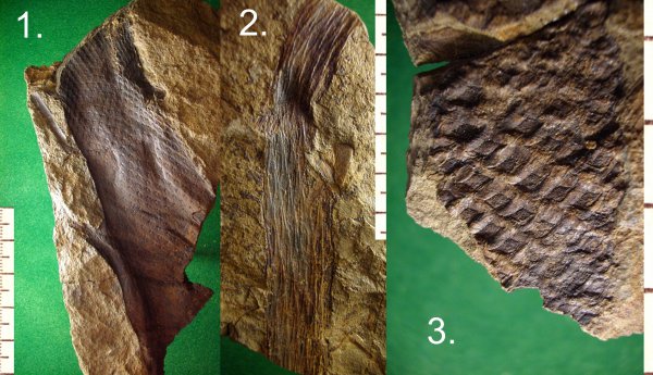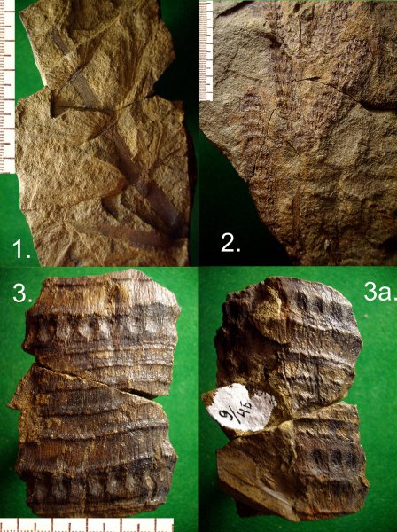 4.Плауновые ( лепидодендроны и лепидофлоиоз )встречаются в двух прослоях в светлом серовато - жёлтом алевролите, в нижнем вперемешку с каламитами только крупные лишённые листьев ветви и отпечатки коры ( фото - 8 фиг.1 и 3 ); в верхнем ( залегает на 15 см. выше ) только тонкие веточки ( фото - 9 фиг.2 ) в этом прослое встречаются насекомые ( фото - 2 ), в изобилии папоротники ( фото - 3 фиг.1 и 2 ) и ветки и колоски каламитов ( фото 7 фиг.1 и 2 )