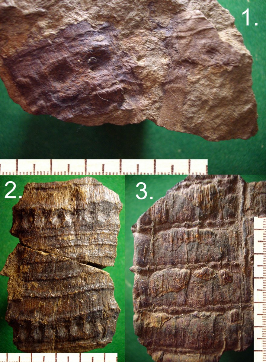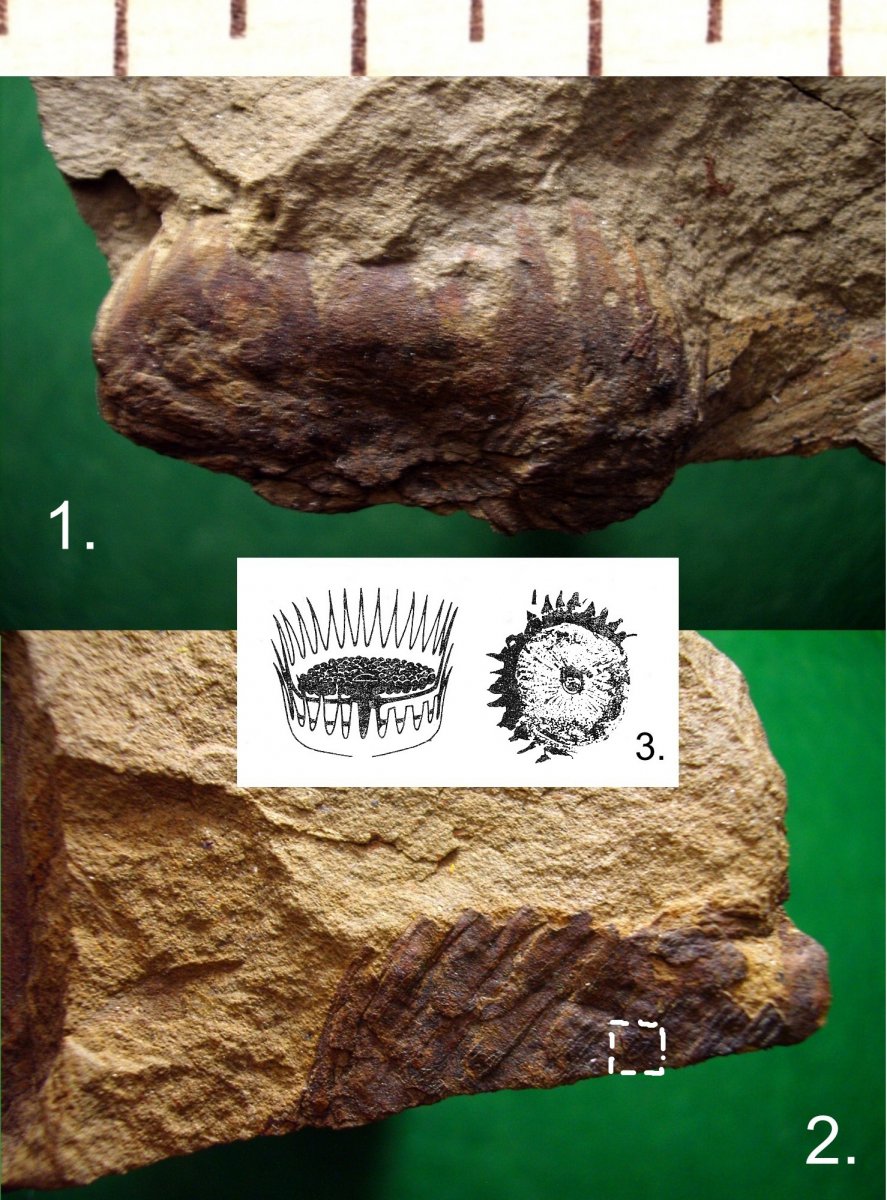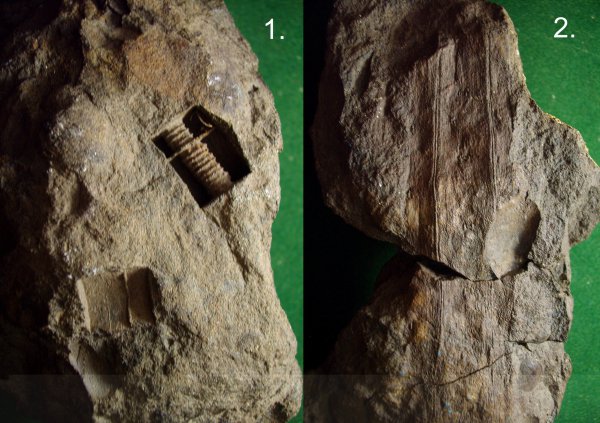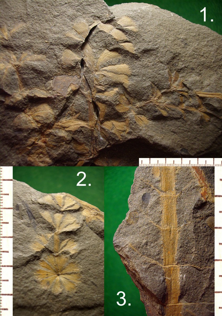 фото-11 ( фото-7 в публикации МЕСТОНАХОЖДЕНИЕ "БАЛКА ЛЕСНАЯ" ) . Стерильный ( фиг.1 ) , фертильный ( фиг.2 ) побеги и ствол Calamites sachsei.