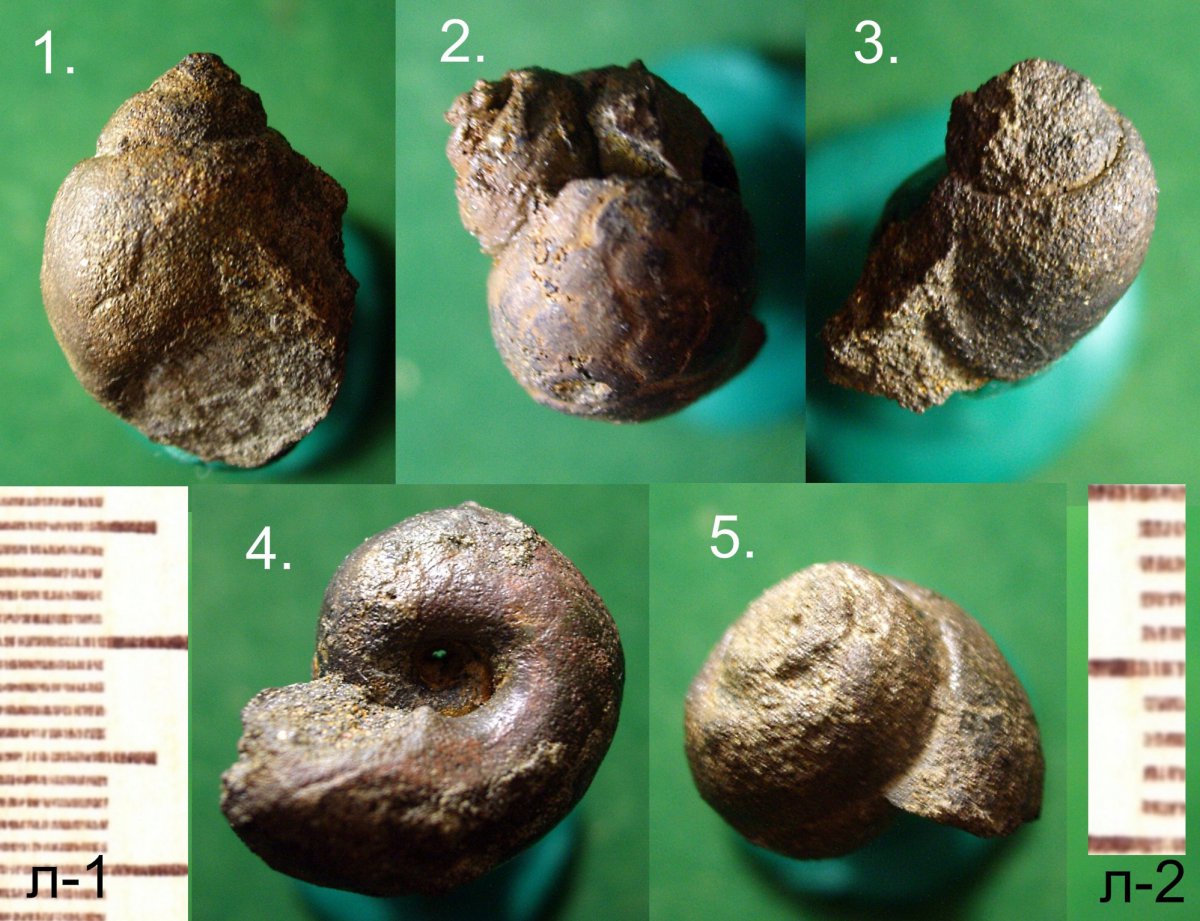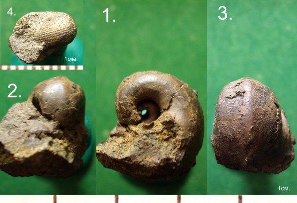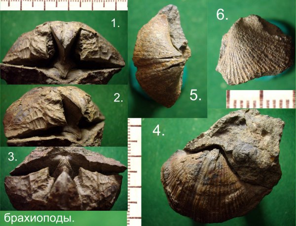 брахиоподы представлены в основном родом Spirihper sp.На фото хорошо видно как с возрастом менялась скульптура внутренней поверхности раковины молодая ( фиг.5 ), среднего возраста ( фиг.4 ) и старая крупная с толстыми створками ( фиг.1,2,3 )