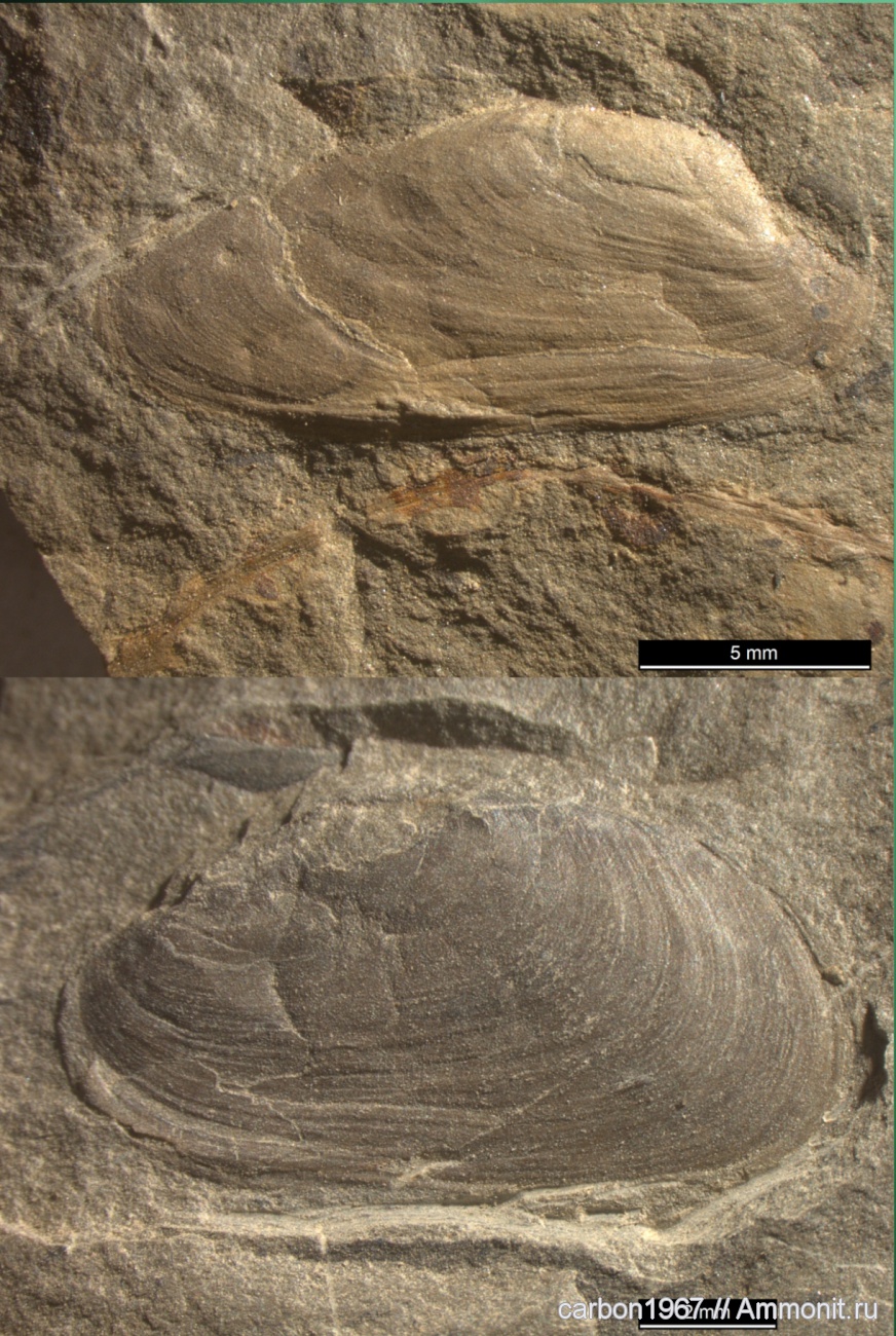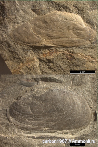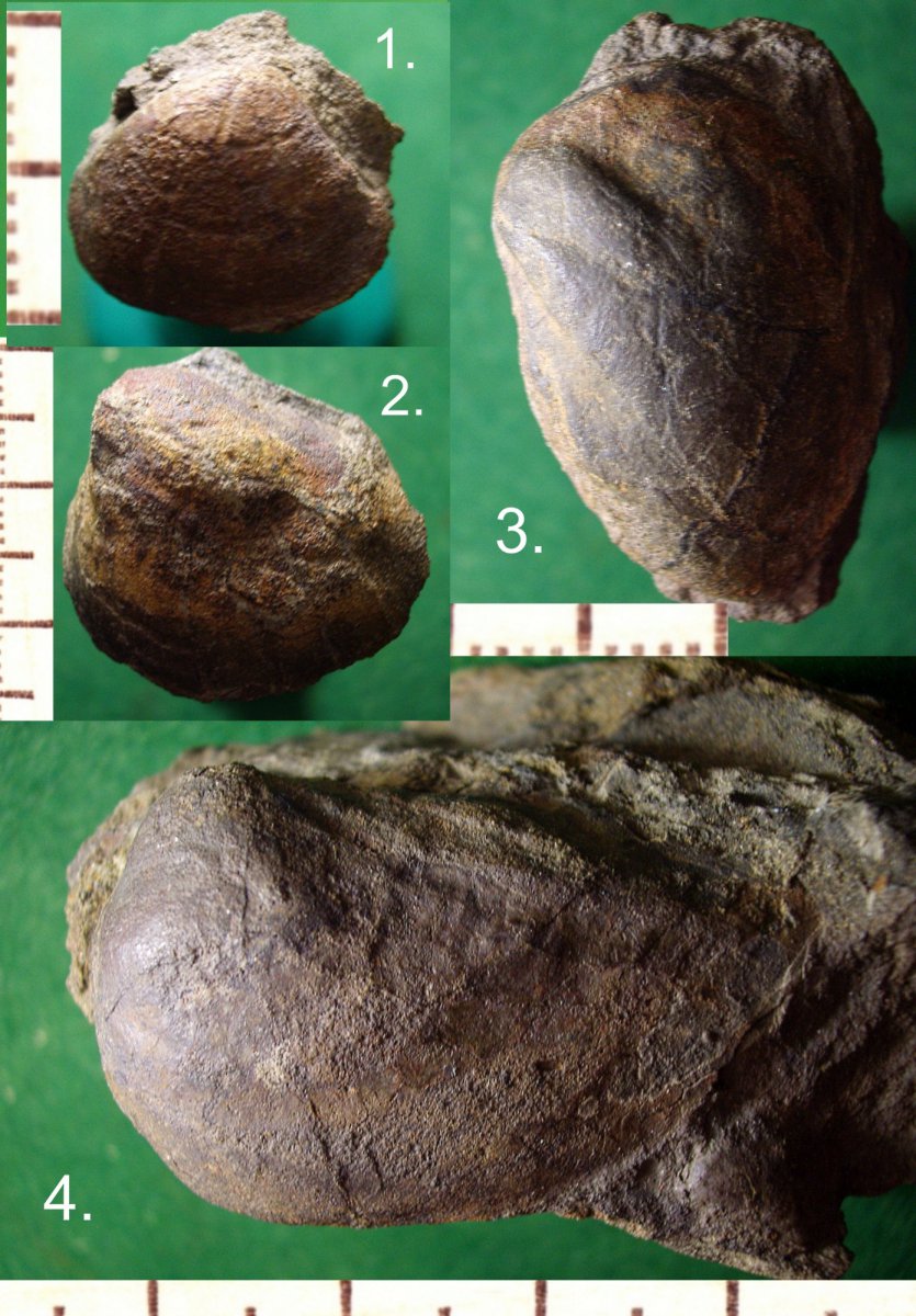 фиг.1,2,3 - Род Pharkidontus, внутренний слепок раковины. на фиг.3 хорошо виден "киль" соответствующий полоске выреза.