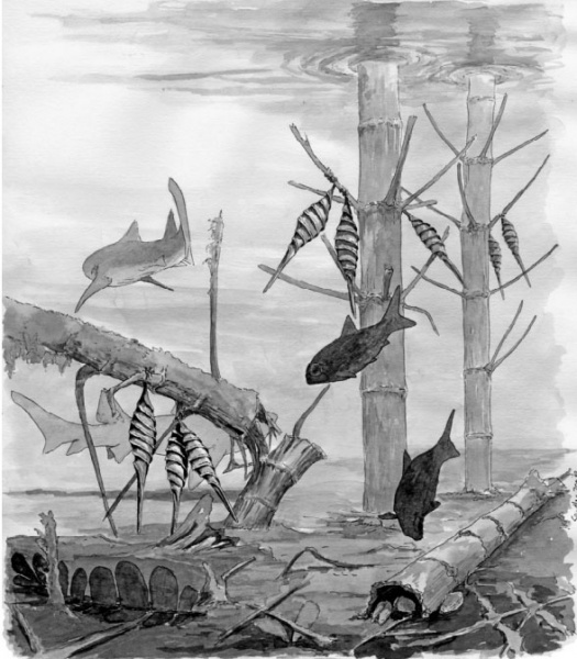 ( да, акулы что древние, что современные откладывают яйца - икринки в плотных оболочках ). Капсулы, которые после того как самки мелких пресноводных акул в не глубоких, хорошо прогреваемых солнцем заводях многочисленных проток каменноугольного леса откладывали на подводных частях растений, закреплялись и твердели.