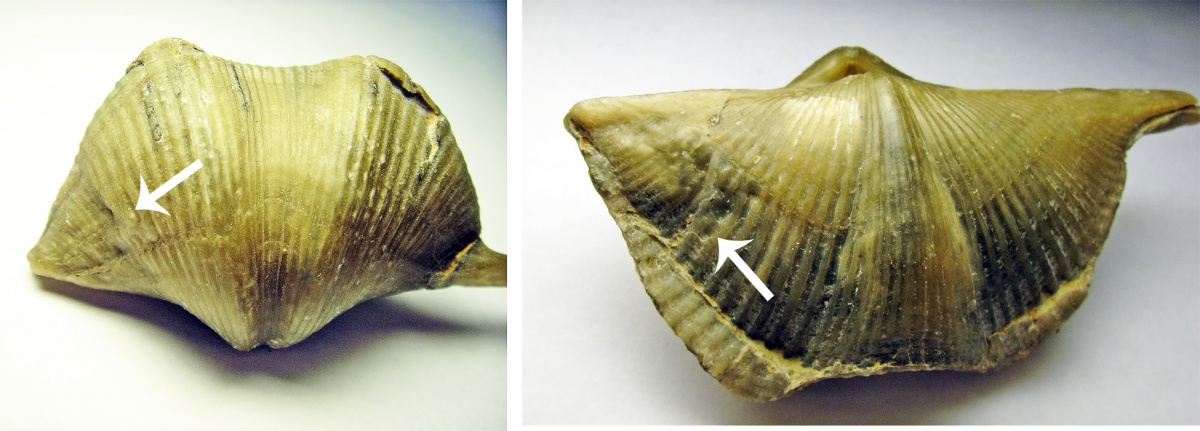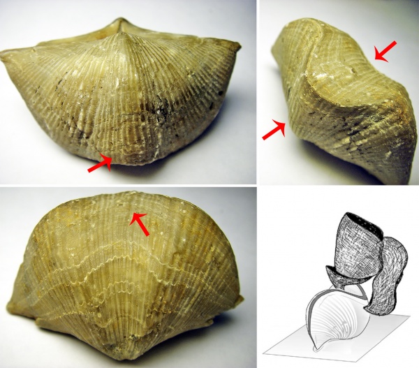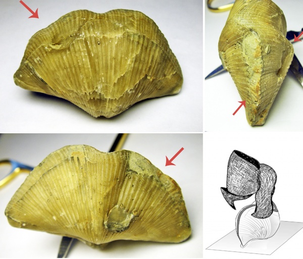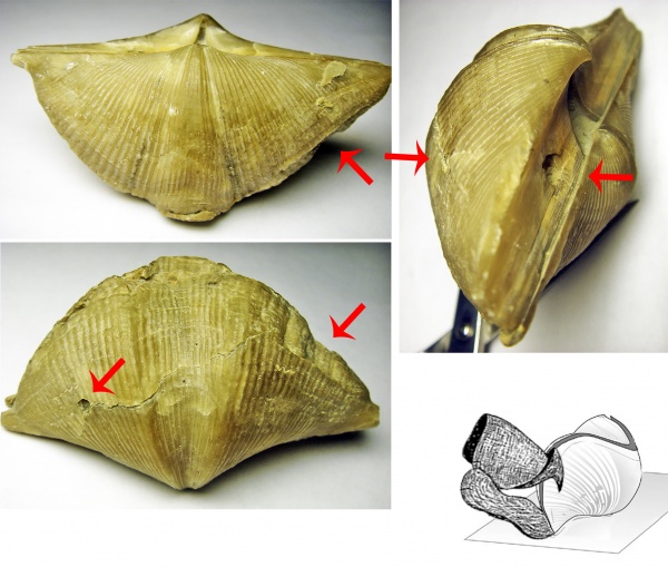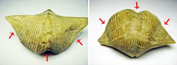 Рисунок 1: Двусторонние повреждение раковины брахиоподы Cyrtospirifer. Форма уродства и расположения шрамов больше указывает на тесноту поселения, чем на прижизненное повреждение. Мною было высказано поспешное заключение про травмирование соседними особями.