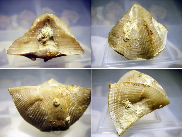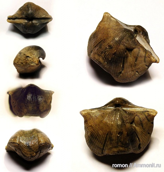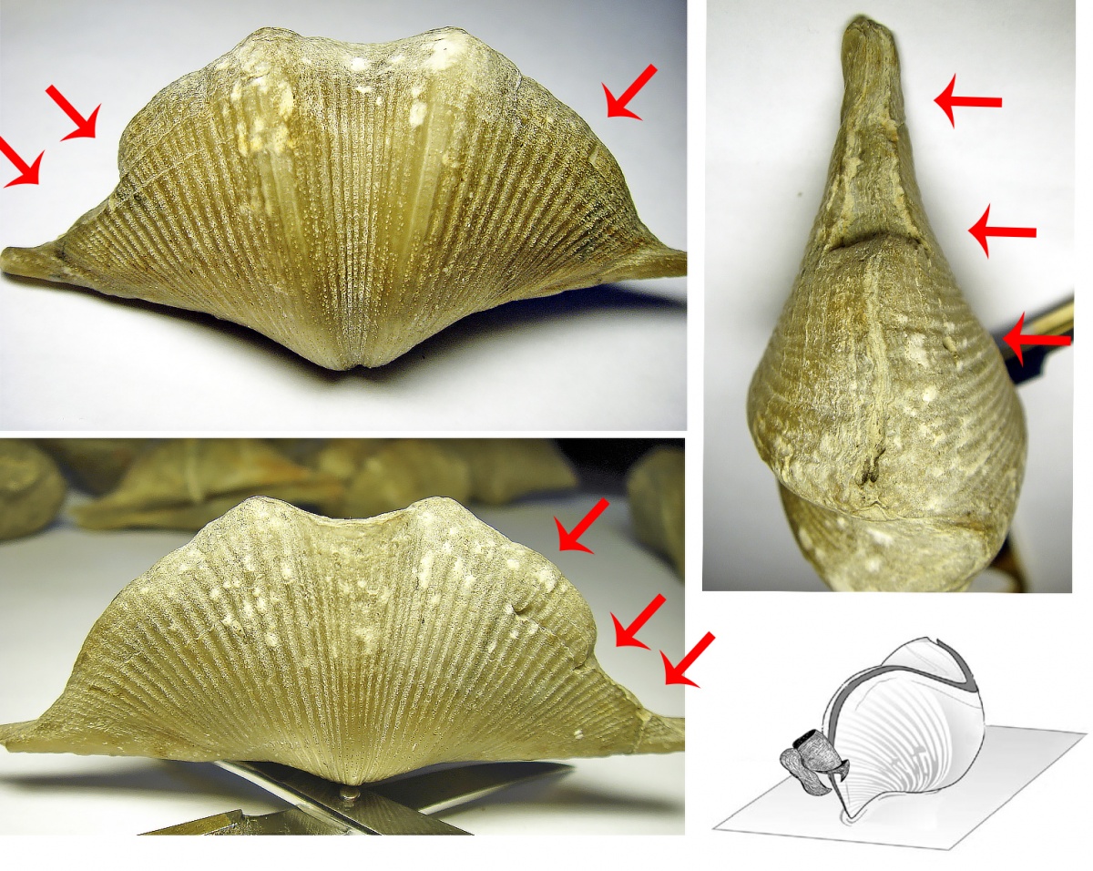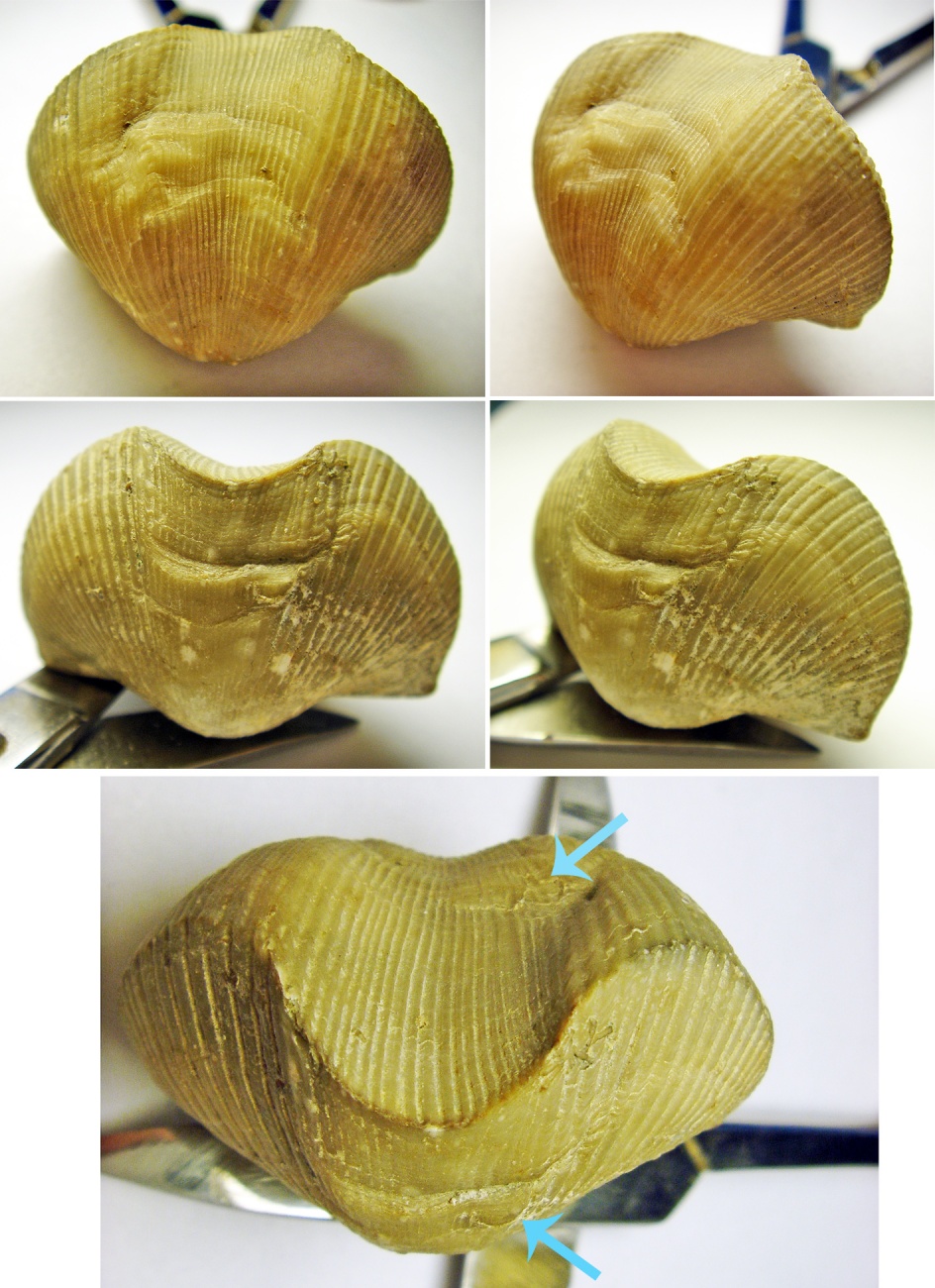Затем мне подарил достаточно интересную раковину пользователь romon. У брахиоподы на рис. ниже на обеих створках присутствуют два прижизненных повреждения, полученных одновременно (пятая фотография в коллаже с синими стрелочками). В результате чего образовался уступ и шрам ("жеванная" раковина). Примечательно, что такие уступы и продольные вдавливания принято относить к "отпечаткам" от соседних раковин в виду тесноты поселения, но в данном случае причинной данного образования послужила травма. Основная сложность диагностирования таких прижизненных повреждений брахиопод является их неподвижный образ жизни т.е. травмы могут наносить "хищники" в виде донных отложений (мусора) при механическом воздействие волн (сильные подводные течения, шторма). Но если бы в данном случае было бы повреждение донными отложениями, то по логике происходящего пострадала бы только одна створка, а здесь мы видим, что повреждены именно две створки с разных сторон брахиоподы. По характеру повреждения хорошо видно, что два повреждения были получены в одно и тоже время на одинаковом расстояние с каждой стороны от макушек раковины. Можно было бы предположить, что удар был нанесен ровно по центру лобного (переднего) края брахиоподы в виду определенных обстоятельств, но массовый характер таких повреждений указывает на некоторую закономерность явления.