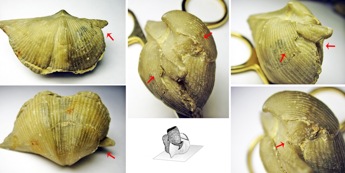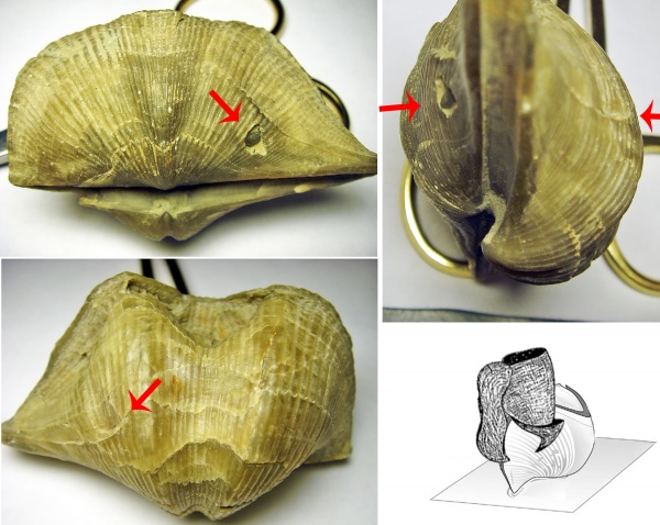 Обратите внимание на примере ниже возможно двоякая интерпретация: или брахиопода подверглась многократному нападению, или имеет место быть нападение другого вида "хищника".