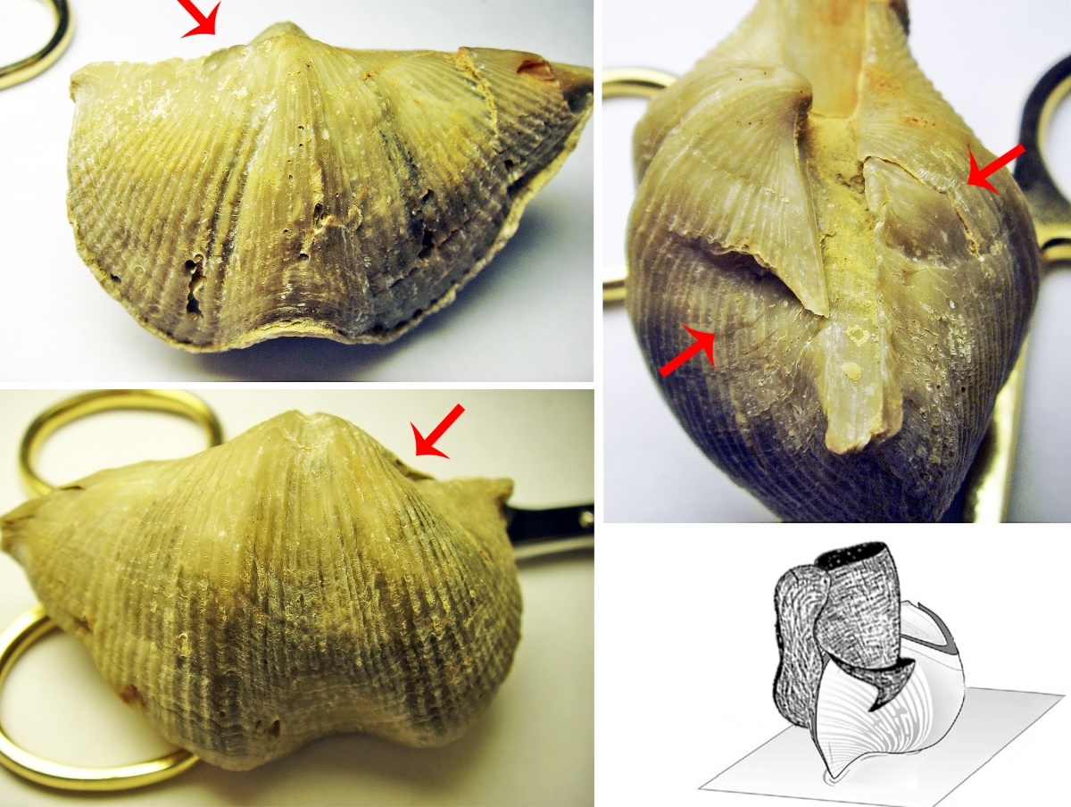 Но это что касается взрослых и уже толстостенных раковин, другое дело обстояло с молодыми особями. Стоит обратить внимание, что на всех приведенных ниже фотографиях нападения были осуществлены именно на молодые особи (1-2 см). Уродства раковины были получены в результате именно отламывания раковины, с повреждением мантии брахиоподы. Брахиоподе не удалось восстановиться после повреждения, поэтому дальнейшее строительство раковины было уже в сторону ее уродства. На фото №9 хорошо видно, что были отломаны ушки, направление скульптуры раковины также изменилось.