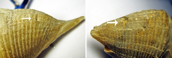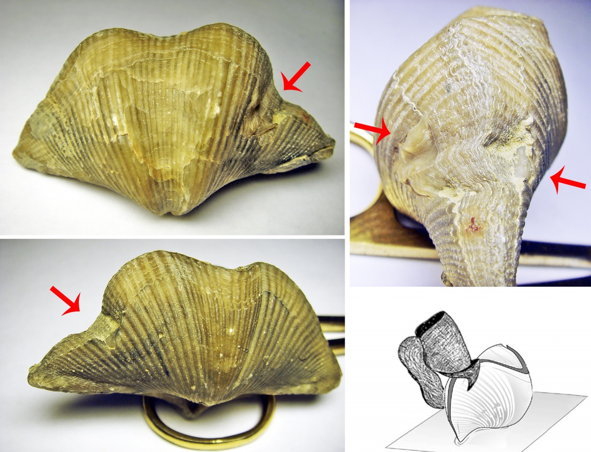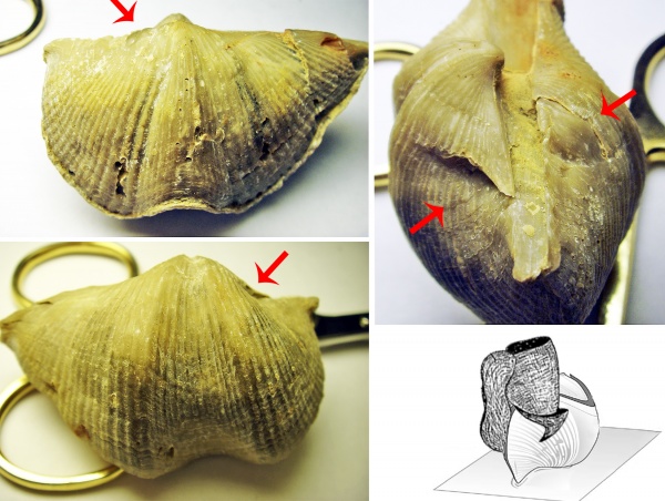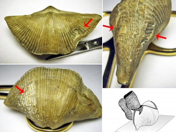 Рисунок: 15 Двусторонние повреждение взрослой брахиоподы с проколом ареи. При этом когда брахиопода была уже взрослой на нее произошло второе нападение Фото, что привело к образованию уступов со шрамами.