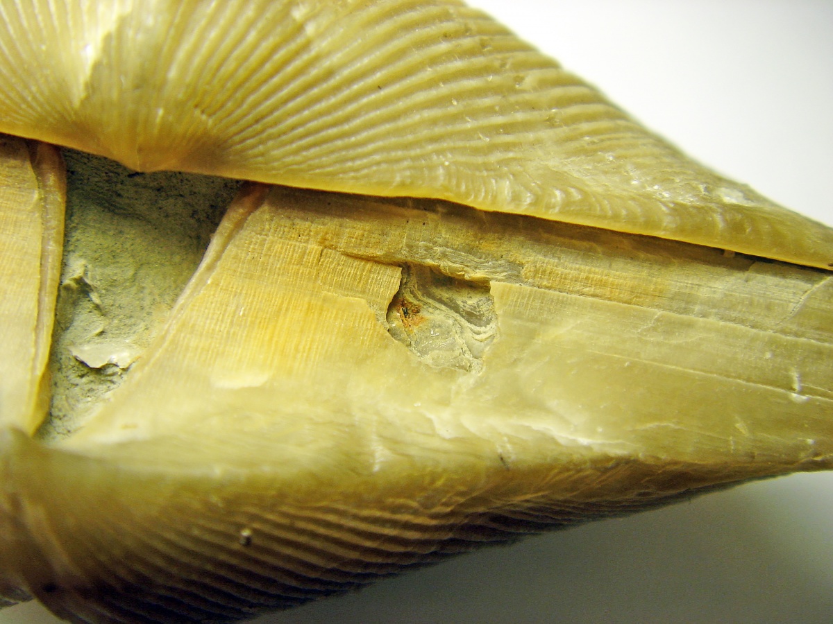 И так, рассмотрим фото-примеры. На фотографии ниже наблюдаются два повреждения, одно частично скрыто донными отложениями, второе представляет собой глубокий шрам на створке брахиоподы. Можно было бы утверждать, что это два не связанных между собой повреждения, если бы не последующие примеры.