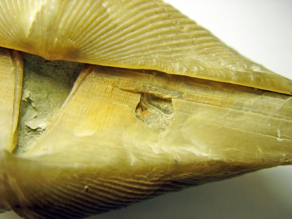 Примечательно, что ушки хорошо подходили под нападение. Видно, что повреждения находятся на одинаковом расстояние, и были осуществлены в одно и тоже время. При этом если проводить аналогии с человеческим ртом, проще укусить небольшое яблоко, чем большое (область ушек по толщине в разы меньше толщины надутого центра раковины).