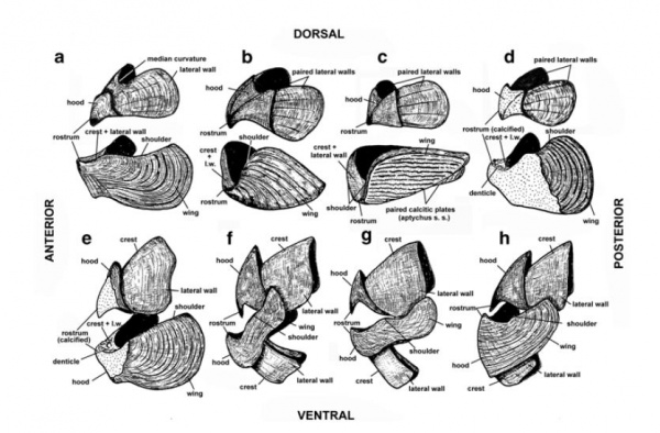 Рисунок: 6 Реконструкции челюстей аммоноидей (Tanabe et al. 2015 Chapter 10 Buccal mass and jaw apparatus). Для всех последующих иллюстраций к фотографиям для наглядности понимания угла атаки и места поражения, я беру одну из данных иллюстраций челюстей.