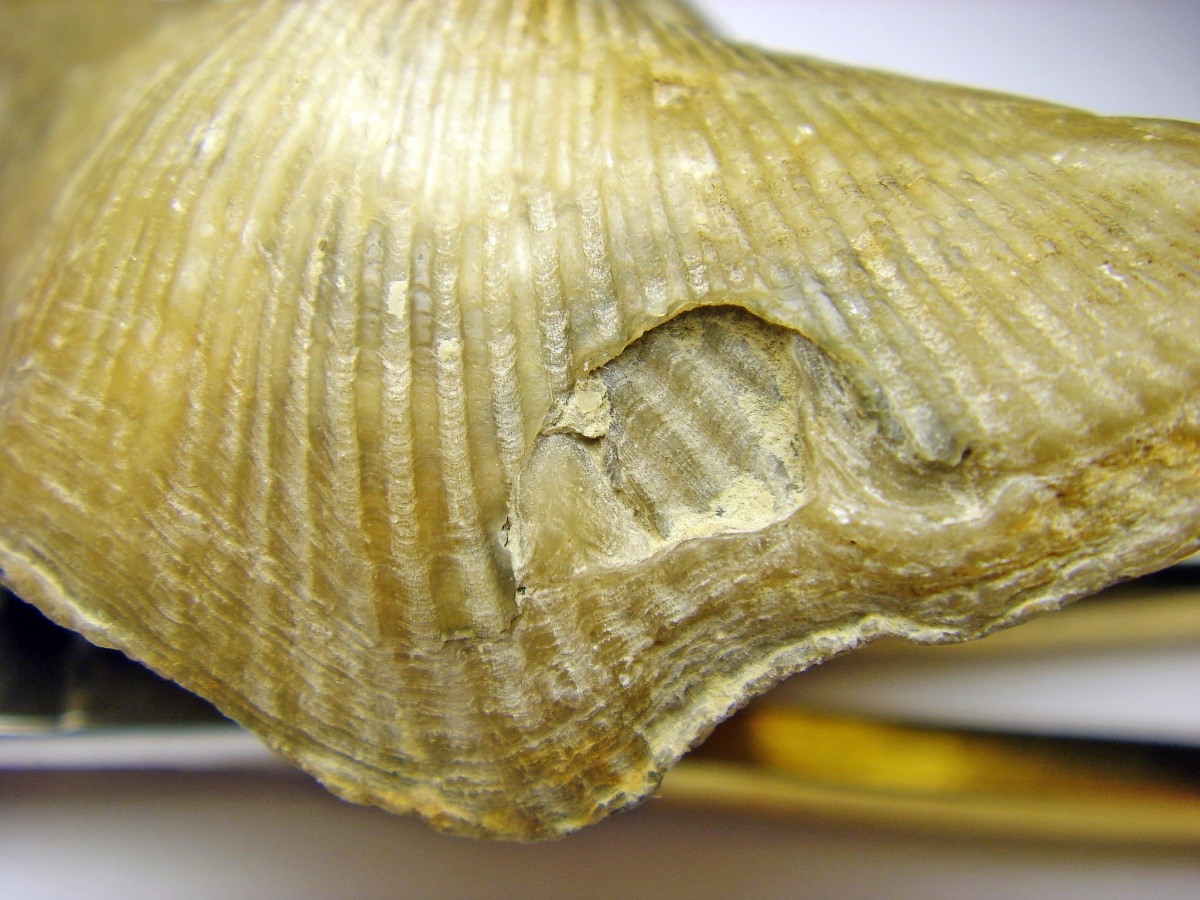 Рисунок: 7 Двусторонние повреждение, затронувшее самый край створок. Интересно, что внутри данного "кратера" поселился загадочный обрастатель Ascodictyon Фото.