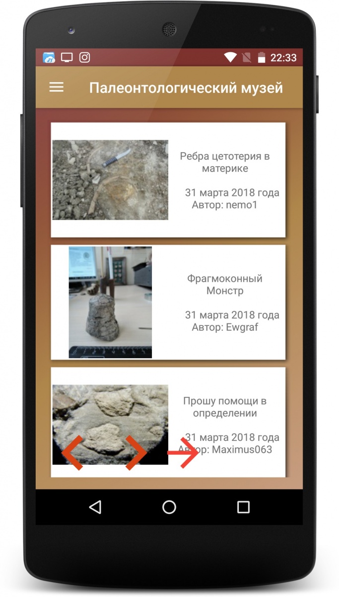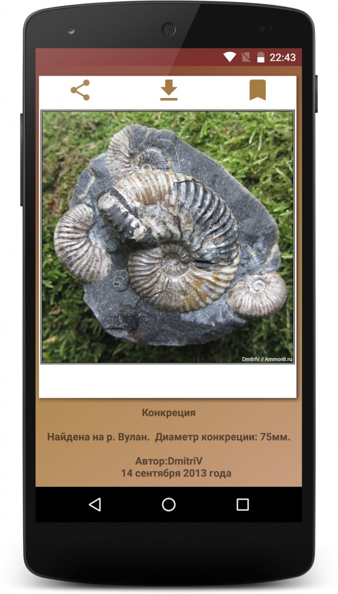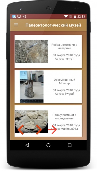 который дает удобную возможность выбирать образцы по эпохам, местам, типу окаменелостей. Также можно отсортировать фото по дате добавления ( этот вид включается при запуске приложения) и по рейтингу. В этой панели также расположились пункты для просмотра новостей, публикаций сайта, а также закладок. Самым главным элементом является cписок изображений