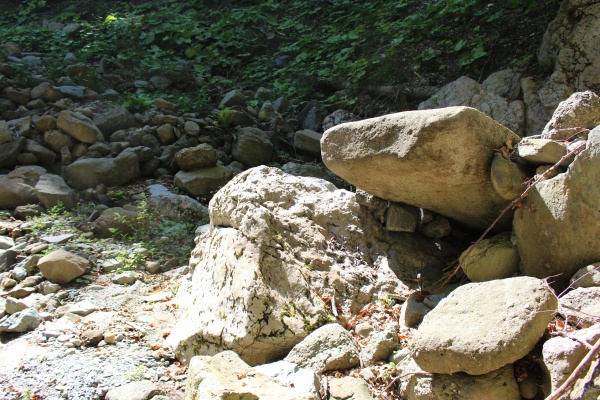 Верхнепермские известняки в Никитинской балке, р. Малая Лаба. В таких глыбах могут притаиться самые последние трилобиты в мире... Фото Э.В. Мычко, 2019 г.