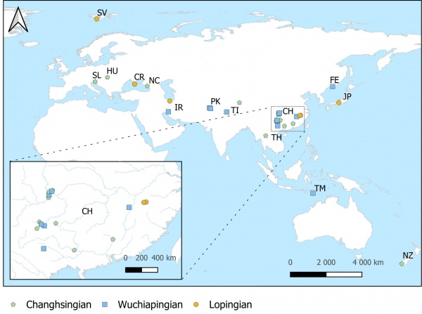 Местонахождения верхнеперских трилобитов: SV – Spitsbergen, SL – Slovenia, HU – Hungary, CR – Crimea, NC – North Caucasus, FE – Far East, IR – Iran, PK – Pakistan, TI – Tibet, CH – Southern China, TH – Thailand, JP – Japan, TM – Timor, NZ – New Zealand.