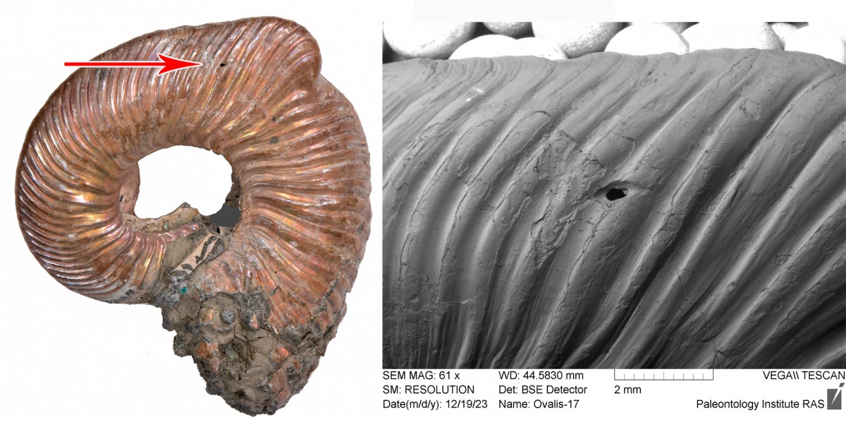 В последние пару лет особенно продуктивным было мое сотрудничество с палеонтологами-любителями из Самарского палеонтологического общества (СПО). Так, в соавторстве с Екатериной Пархоменко (Katerina) на собранных ей аммонитах был изучен редкий и малоизвестный тип палеопатологии Forma aegra augata (Новая гипотеза о причинах формирования палеопатологии forma aegra augata у юрских аммонитов и Новая гипотеза о причинах формирования палеопатологии forma aegra augata), описан новый тип смертельных повреждений на раковинах головоногих моллюсков и предложена новая гипотеза о присутствии среди юрских аммонитов ночных видов (Окулярный синус на устье юрских аммонитов как индикатор их образа жизни). Благодаря изучению «горбатых» аммонитов совершенно случайно на одном из них удалось найти древнейший и пока единственный образец сверления Oichnus ovalis юрского возраста. В современных морях сверления такого типа оставляют на раковинах своих жертв только осьминоги. Эта находка совсем недавно была опубликована (см. Юрские осьминоги могли охотиться на аммонитов).