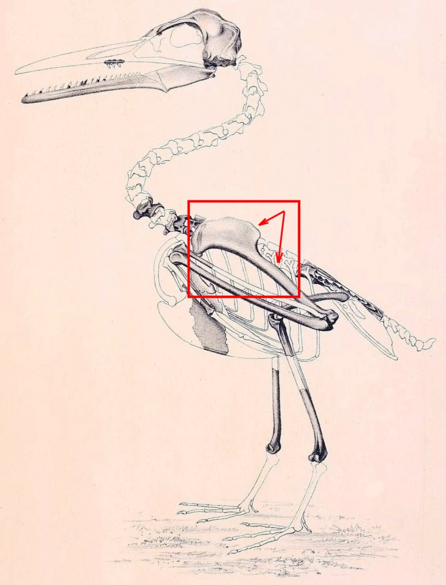 Рисунок - 1. Скелет ихтиорниса. Выделена красным головка плечевой кости. Изображение из интернета в свободном доступе.