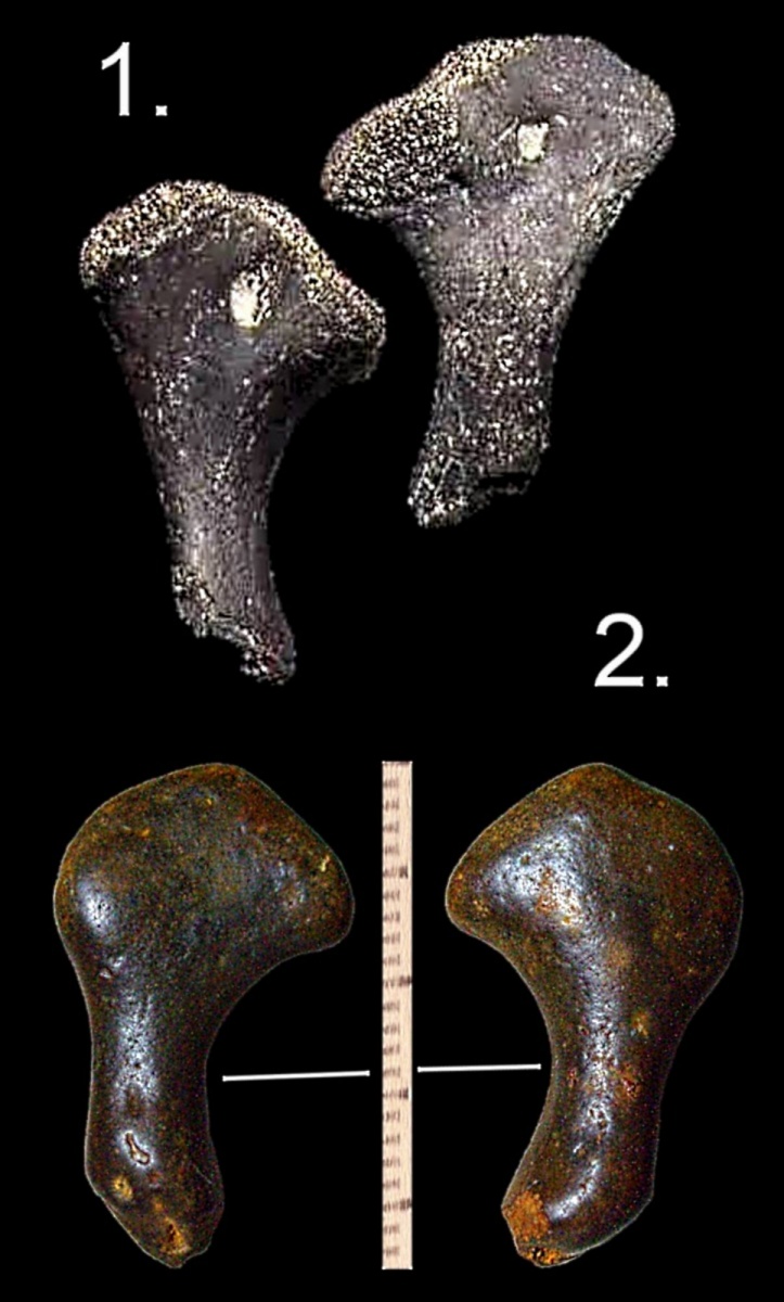 Продолжаю разбор летних находок. В «странных» галечниках попалась интересная штучка ( см. табл.-1 ),она очень похожа на вот эту находку, только гораздо крупнее. ( см. табл.-2 ) О, сколько мне гадостей наговорила одна не уравновешенная особа, по поводу этих находок. Согласитесь, они практически идентичны. Меня не давала покоя мысль, что это ? Вряд ли случайная игра природы. Я лопатил массу литературы, просматривал кучу изображений. И тут мне попался на глаза рисунок скелета зубастой птички ихтиорнис. ( см. рис.1 ) Вот оно ! Обратите внимание на косточку, выделенную красной рамочкой. По всему выходит что мои ( и английская ) находки являются головками плечевых костей птиц. А если учитывать возраст моих ( в. мел -палеоцен ) находок, то вполне возможно предположить, что эти косточки принадлежат зубастым птицам.