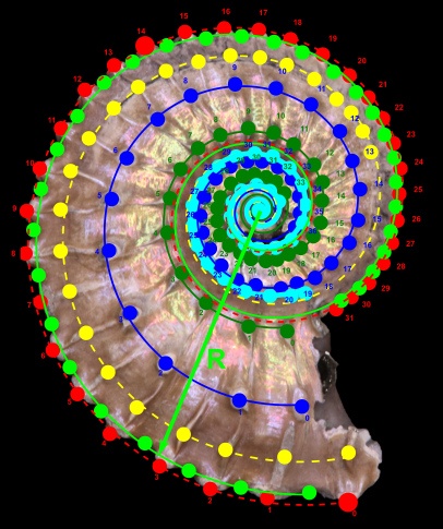 Вся геометрия раковины хорошо аппроксимируется логарифмическими спиралями. Идеальной аппроксимации мешает сохран, искажения при съёмке и разметке, смена стадий онтогенеза и отклонения в развитии аммонита, связанные с травмами, недоеданием/перееданием и пр.