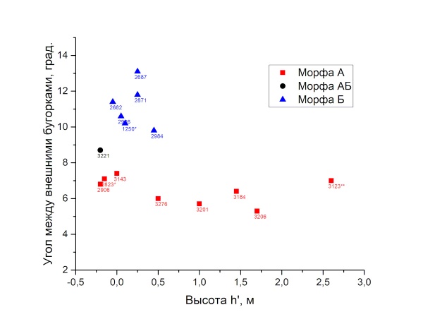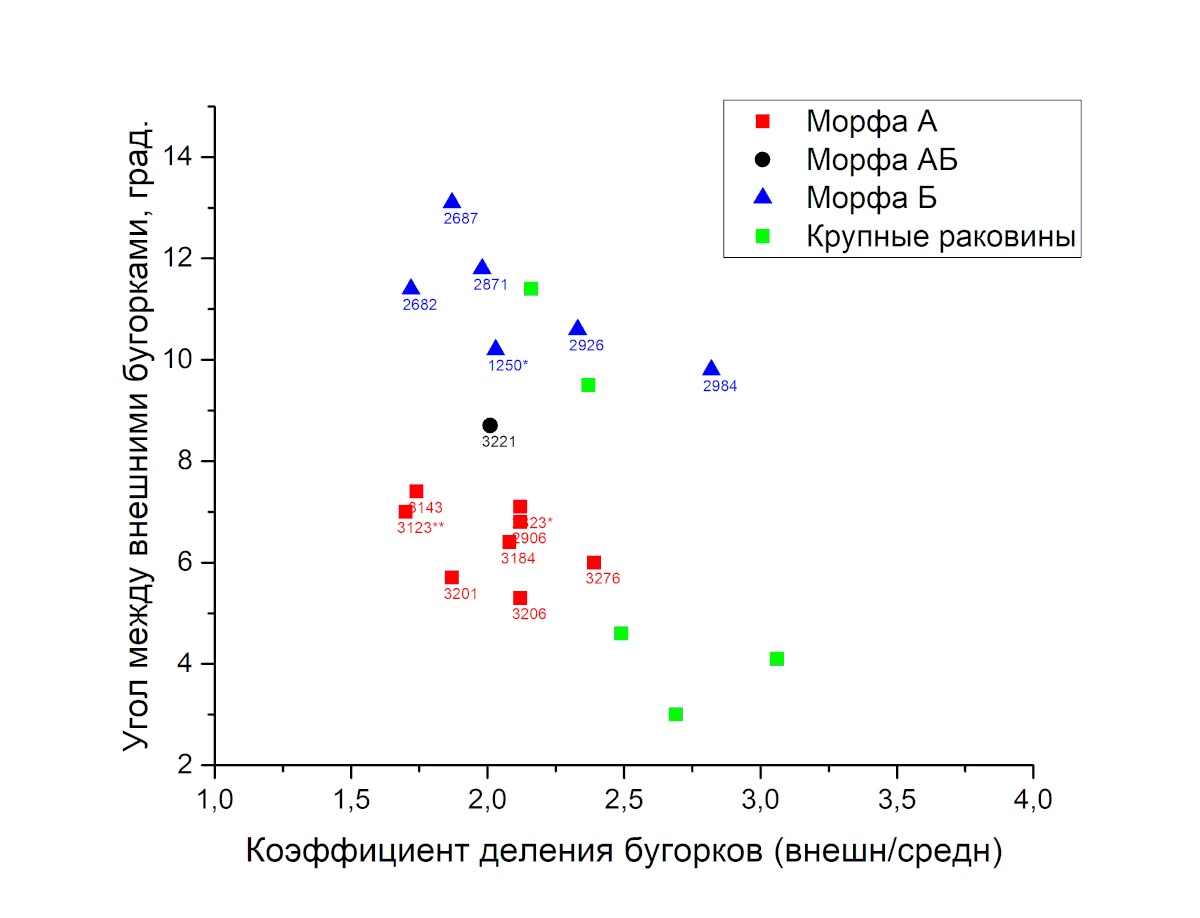 Отбраковав несколько образцов по размеру и сохрану, я отобразил все образцы в координатах угол-коэффициента деления бугорков: