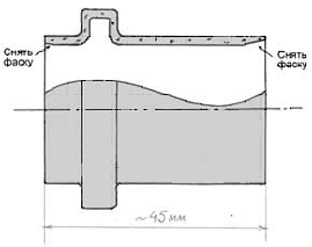 Для изготовления адаптера используем утолщённую часть трубы, где находится герметизирующая резиновая прокладка (прокладка нам не понадобится, удаляем её). Теперь нужно убедиться, что труба с трудом надевается или вообще не надевается на посадочное место у основания объектива фотоаппарата. Скорее всего, она не будет надеваться. Тогда нужно острым ножом слегка снять фаску изнутри под углом 10-15 градусов к оси трубы, после чего она будет плотно садиться на посадочное место. Снять фаску нужно настолько, чтобы труба не болталась на посадочном месте, но в то же время усилие, с которым она насаживается на посадочное место, не привело бы к его порче (точнее к расшатыванию съёмного кожуха на модели G5). После этого труба обрезается так, чтобы длина нашего адаптера была 4,5 - 4,6см. Проще всего сделать это ножовкой, окончательно довести напильником. Важно выдержать перпендикулярность среза оси трубы. Теперь готовим место под макрокаплер. С передней стороны адаптера изнутри снимаем фаску под углом 15-20 градусов к оси трубы так, чтобы в получившийся конус макрокаплер вошёл бы с заметным усилием (стороной с резьбой М52). От того, насколько туго он войдёт, будет зависеть надёжность фиксации вспомогательного объектива. Если не удалось добиться надёжной механической фиксации макрокаплера в конусе адаптера, можно усилить сцепление клеем (например "Супер Момент"). Правда в этом случае макрокаплер навсегда останется при адаптере.