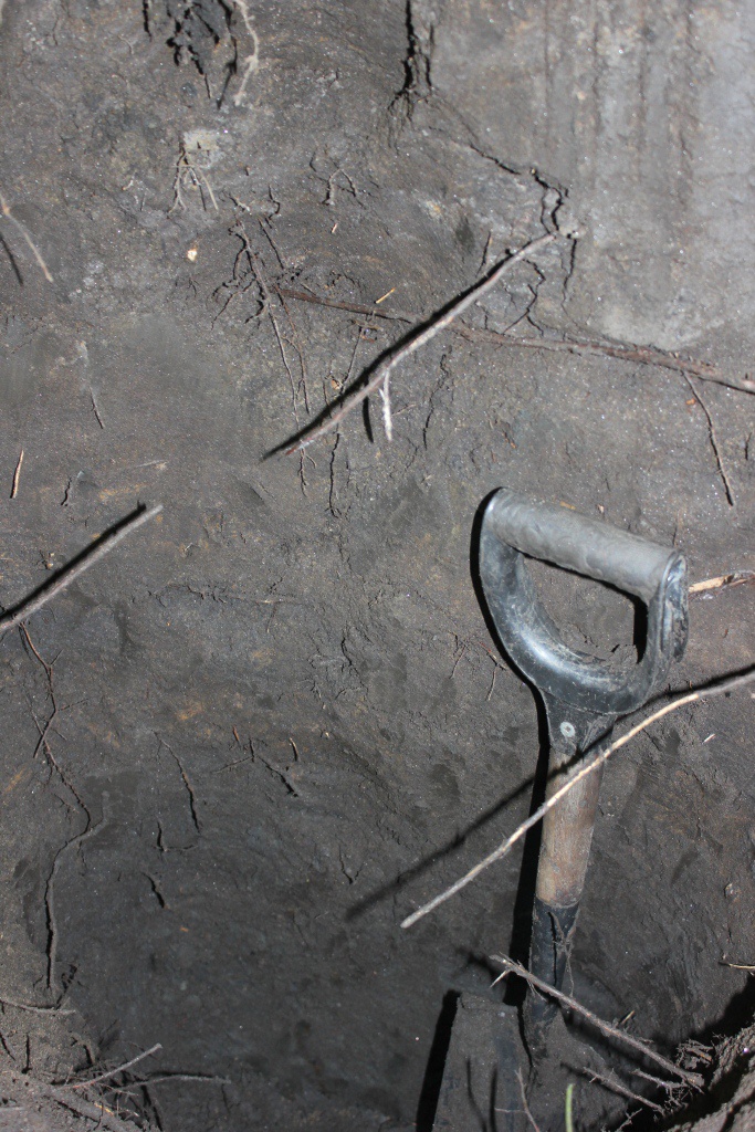 В верхней части под тонким слоем песчаного грунта открываются грязно-серые пески (примерно см 30-40) с небольшими вкраплениями грязно-жёлтых песков.Ниже идёт слой чёрных глинистых песков с мелкими слюдяными вкраплениями Довольно часто попадаются белемниты.