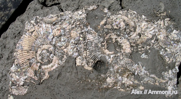 Но про этих аммонитов я знал и собственно за ними и ехал. Неожиданным и приятным сюрпризом оказались довольно крупные кальцитовые и кальцито-пиритовые Deshayesites в сидеритовых конкрециях.