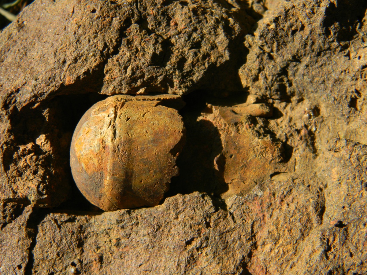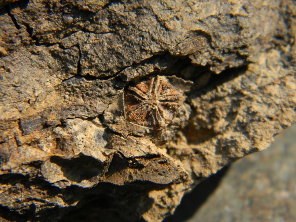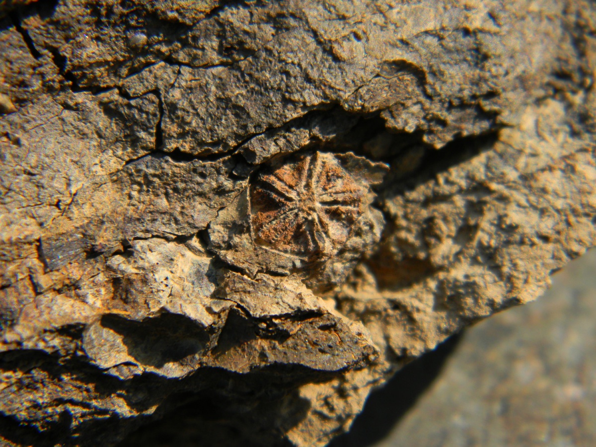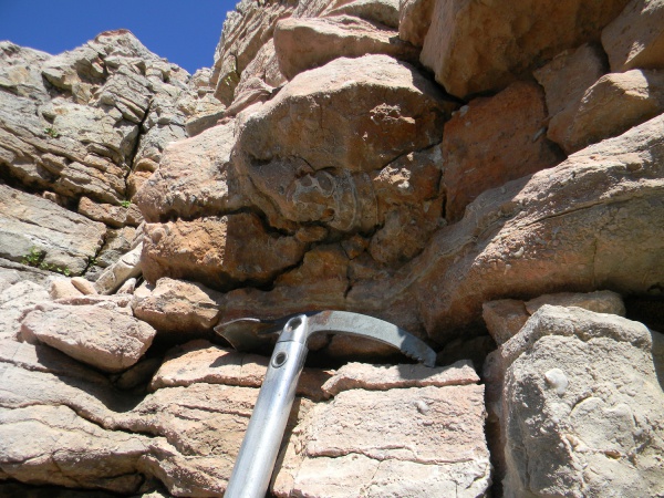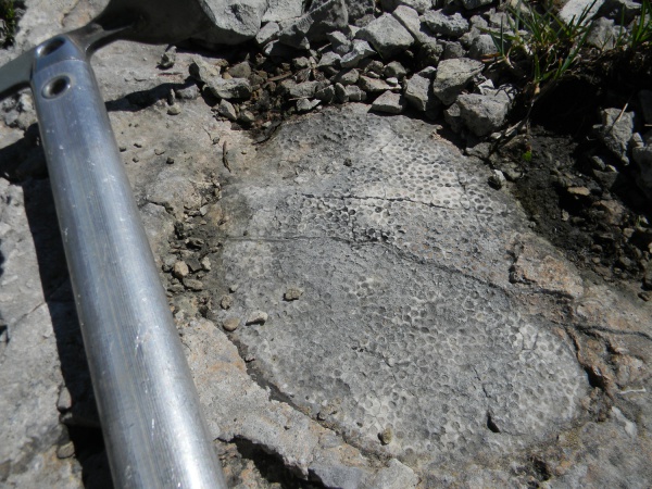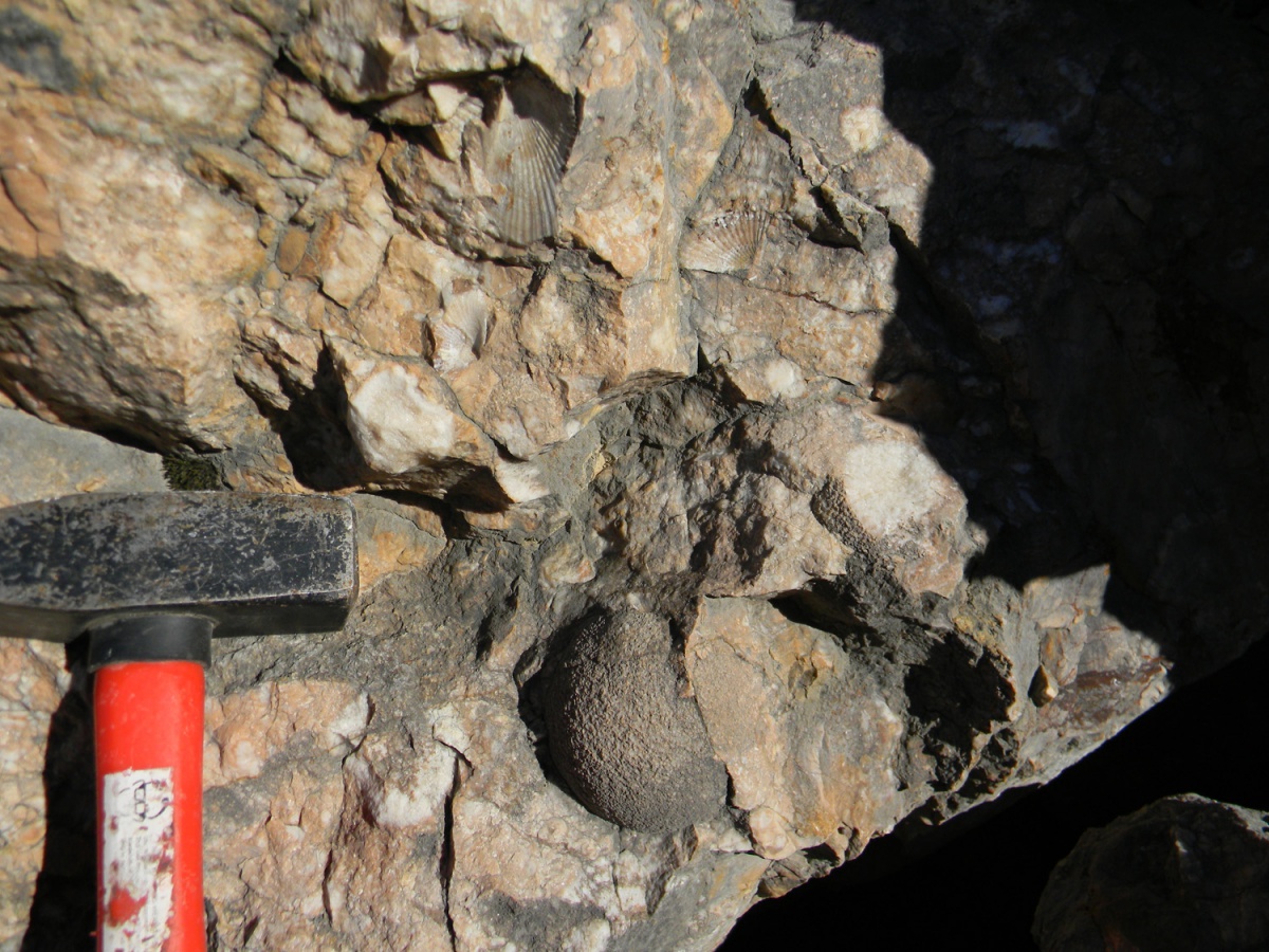 Со стороны осыпь выглядела вполне безобидно, но когда мы, с «младшим научным сотрудником» ступили на нее, камни под ногами ожили, заставляя нас каждый шаг обдумывать, словно в шахматах. Мои мечты о развалах фоссилий таяли на глазах - несмотря на большую площадь, содержание ископаемых раковин было смехотворно мало. Коллега, карабкающийся вслед за мной, начал недвусмысленно выражать недовольство таким безобразием. В душе я сним полностью был согласен, но виду не подавал. На середине подъема попались первые намеки на «жизнь». В глыбе известняка я заметил отпечатки раковин пелеципод и странные шары. По простоте душевной понадеялся, что это могут быть морские ежи, но детальный осмотр оставил больше вопросов, чем ответов. На ежей шары идеальной формы не тянули, а кто это мог быть, было не понятно. На всякий случай я отнес их к оолитовым образованиям.
