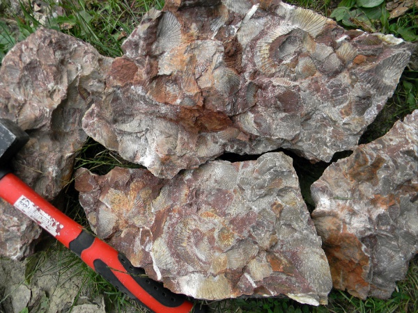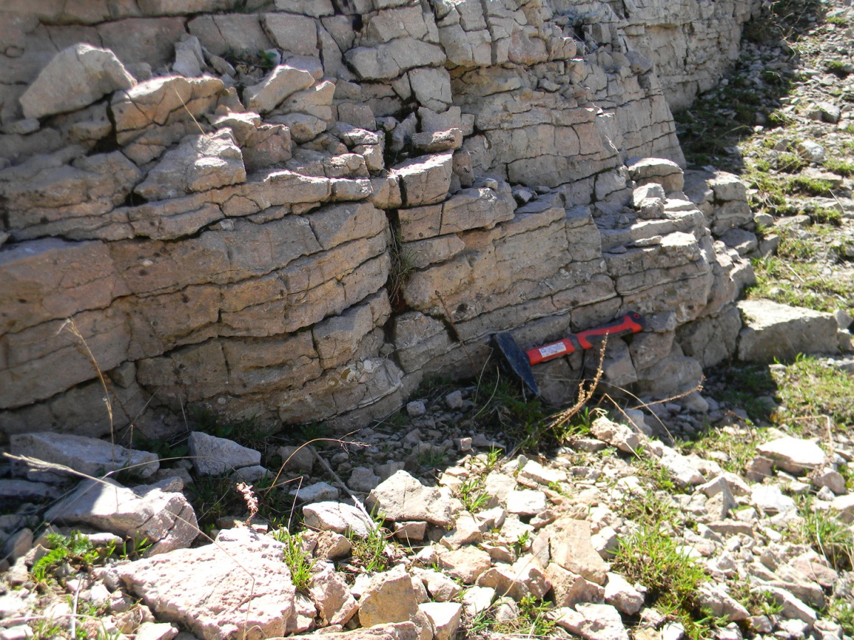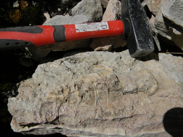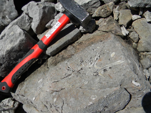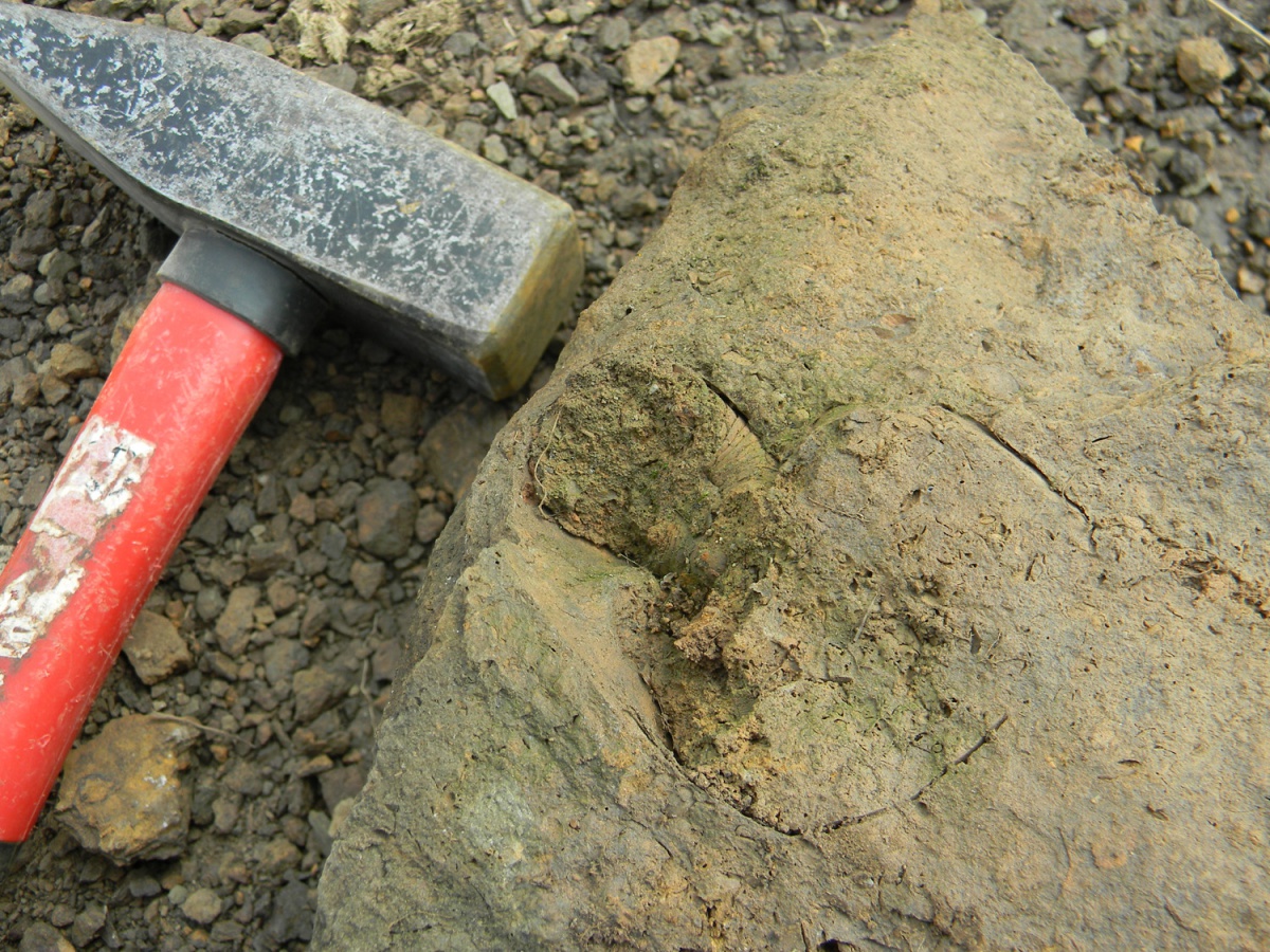 Оказалось, не зря он привлек мое внимание. В обнажении проглядывали слои переполненные остатками гастропод. В ход пошел молоток и зубило. Надо заметить, что выбивание раковин из весьма прочного известняка занятие тяжелое и требует железных нервов; один неверный удар – и образец испорчен. Тем не менее, «жертв» избежать не удалось, но все осколки были собраны и аккуратно упакованы.