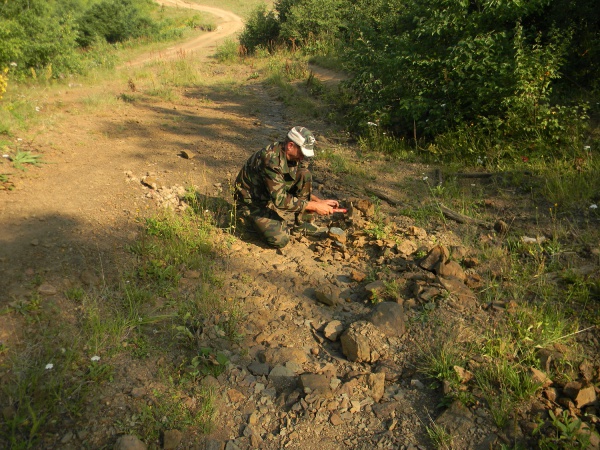 Далее наш путь лежал в сторону Гузерипля, откуда предстояло добраться до Даховской, а затем до Новопрохладного. Из Новопрохладного, в сторону Большого Тхача, вела грунтовая дорога, по которой мы и добрались к месту до слияния Мал. И Бол. Сахрая. Здесь было решено остановиться на ночевку, что позволяло мне пройтись по речному аллювию с молотком. А поколотить было что – впервые я увидел красные триасовые известняки! В качестве лирического отступления замечу – это была моя давняя мечта, наконец-то осуществившаяся. По долине Сахрая раздался стук молотка, все «подозрительные» глыбы были стерты в пыль. «Младший научный сотрудник» увлекся так, что долгое время не желал отдавать молоток, внезапно оглохнув, он игнорировал мои просьбы. Результатом дробления породы стала небольшая коллекция брахиопод, в составе которых преобладали ринхонелиды, а также усеянные монотисами пелециподовые банки.
