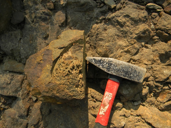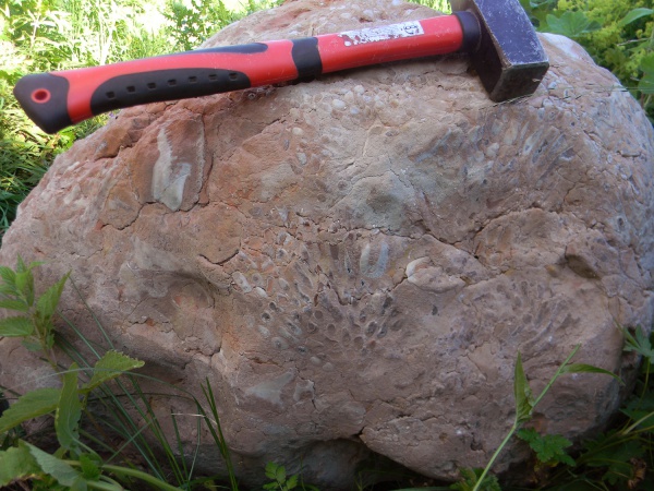 Добравшись до скалы мы стали траверсировать склон осыпи, очень внимательно всматриваясь в камни. За спиной раздался голос коллеги, призывающий вернуться немного назад. Неохотно я направился обратно. Сергей сидел верхом на камне; с укором глядя на меня, он параллельно указывал на него пальцем. Я догадался, что дал осечку. «Вскрытие» преподнесло приятный сюрприз – камень оказался пелециподовой банкой, просто нашпигованной монотисами. Пришлось «зависнуть» на добрый час. Сменяя друг друга, мы разнесли глыбу в пух и прах, явив на свет несколько целых образцов и кучу щебня. К сожалению плотные наслоения ядер раковин сыграли нам не на руку, скорее наоборот. Тем не менее, несколько образцов в относительно полной сохранности удалось добыть.