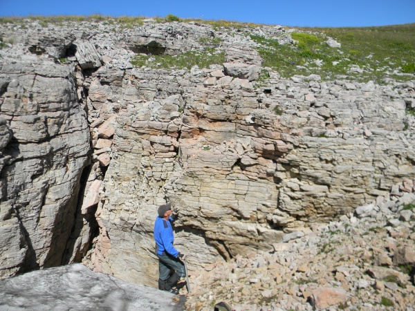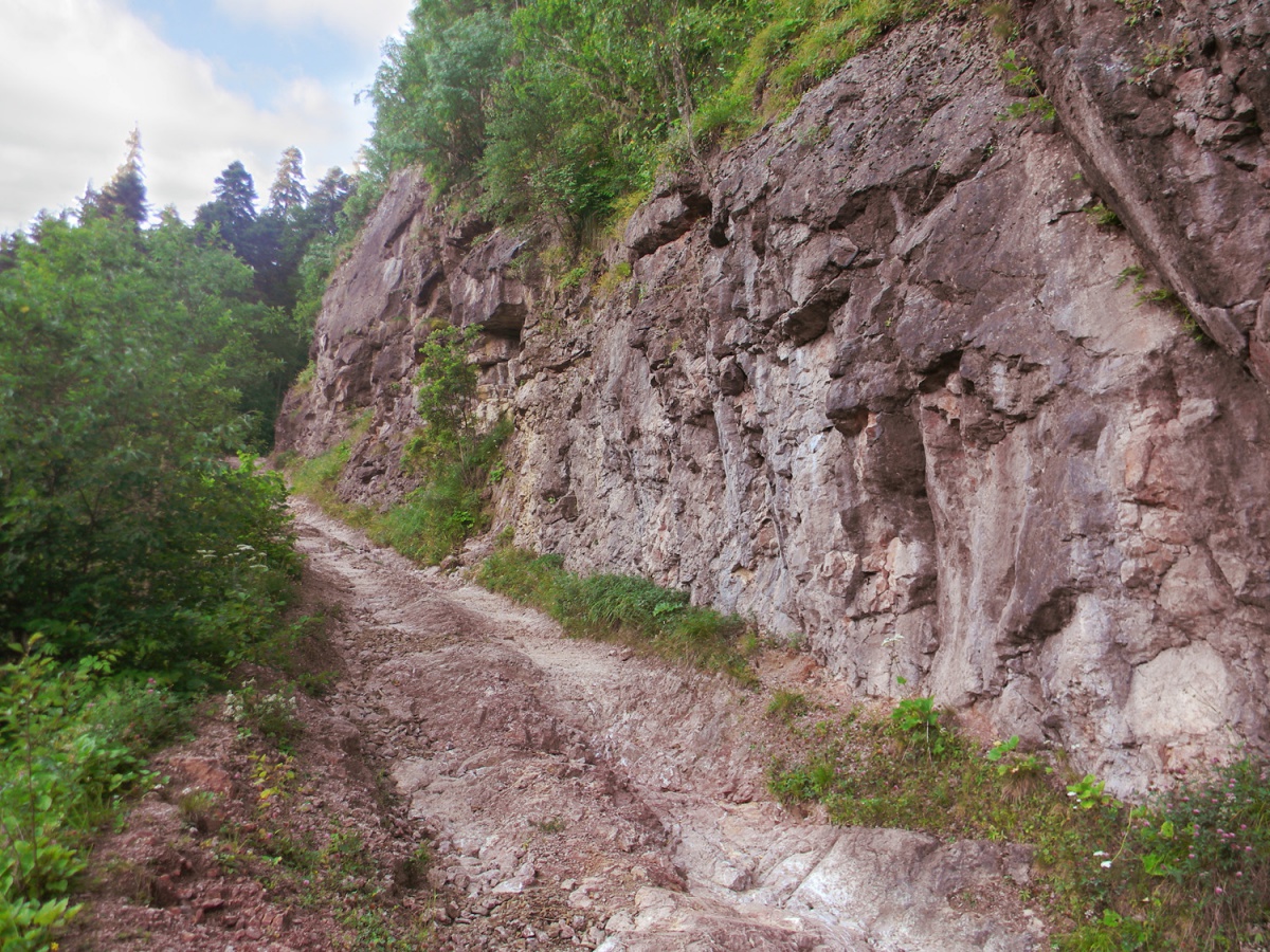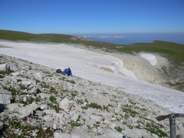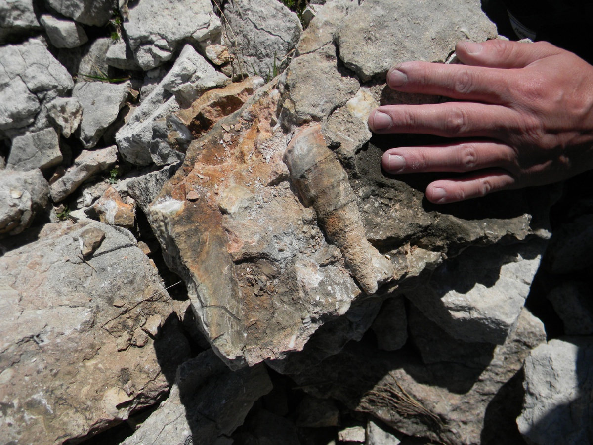 Хотя мне было выделено целых два дня (большая роскошь в условиях пеших переходов), прибыв на место, я не стал затягивать со сборами и с раннего утра, в компании своего друга и по совместительству «младшего научного сотрудника» Сергея Безух, отправился в дорогу. Исключив уже обследованные в прошлом году северные участки хребта, мы принялись за его «сердце» - центральную часть. Здесь было где разгуляться - в многочисленных карстовых провалах и трещинах обнажались позднеюрские известняки. Несмотря на изобилие естественных обнажений собирать «лопатой» ископаемые не очень-то получалось. Фоссилии сами в карман не прыгали, чтобы их найти, нужно было походить. На одной из россыпей нам наконец повезло. Первую находку сделал мой коллега, это оказалась неренея, вслед за ней стали попадаться и другие. Внимательно обследовав россыпь мы отправились дальше, в сторону каньона реки Цица. Издалека стал заметен провал, стены которого имели четко выраженную слоистость, стало любопытно и я прибавил шаг.