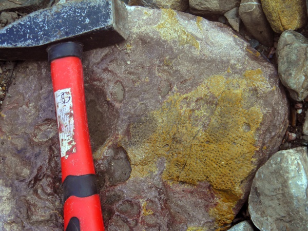 На следующий день мы остановились в истоках реки Цица. Фации немного поменялись, в сухом русле правого истока реки Сергей Ткач нашел валун розового известняка с кораллами. Извлечь их возможности не было, поэтому пришлось довольствоваться фотографиями.